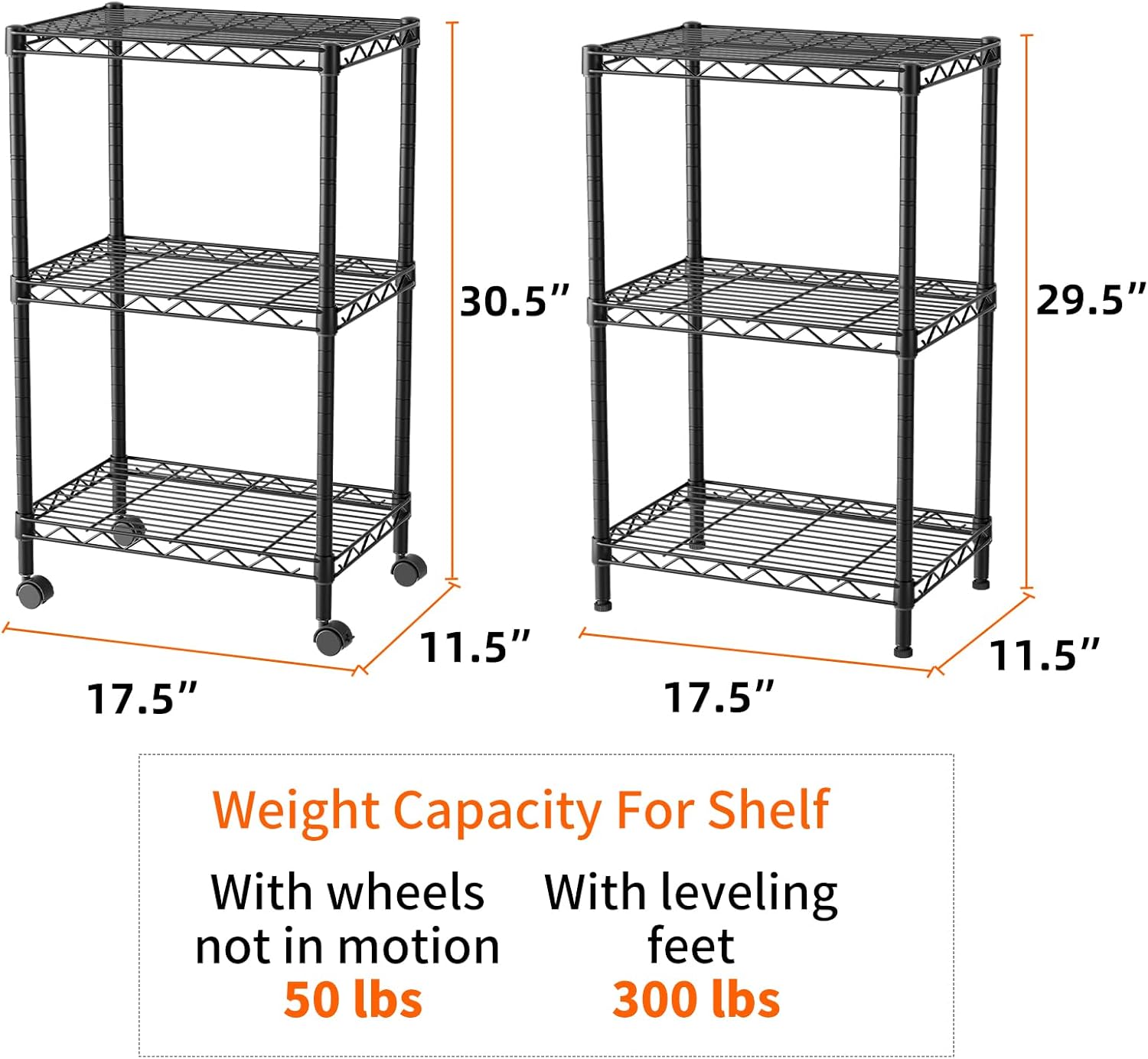 SINGAYE 3 Small Shelves Storage Shelf Wire Shelving Unit Metal Shelf Adjustable Organizers Storage Shelving with Wheels for Bathroom Laundry Room Kitchen Pantry11.5”D x 17.5”W x 30.5”H Black
