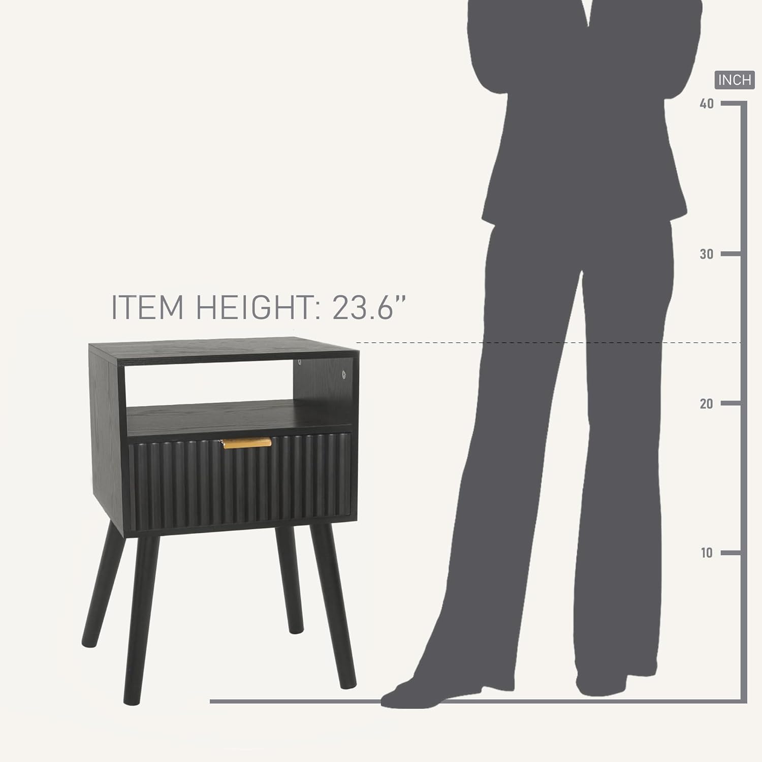 Black Nightstand, Modern Bedside Table with Fluted Drawers, Small Night Stand with Storage and Solid Wood Legs for Bedroom, Dorm and Small Space (Black)