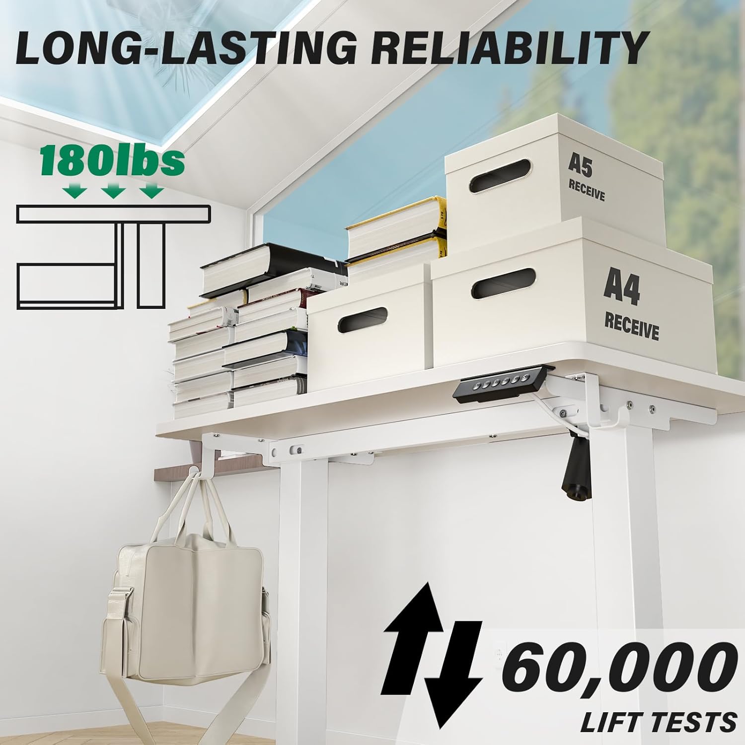 - Sturdy Frame for Superb Load-bearing Capacity: The overall frame of the electric desk is constructed with a 1.5mm heavy-duty steel frame structure, combined with a thickened desktop, ensuring the long-term stability and durability of the standing desk electric. It has a load-bearing capacity of up to 180 LBS and has passed 60,000 lift tests after years of use.