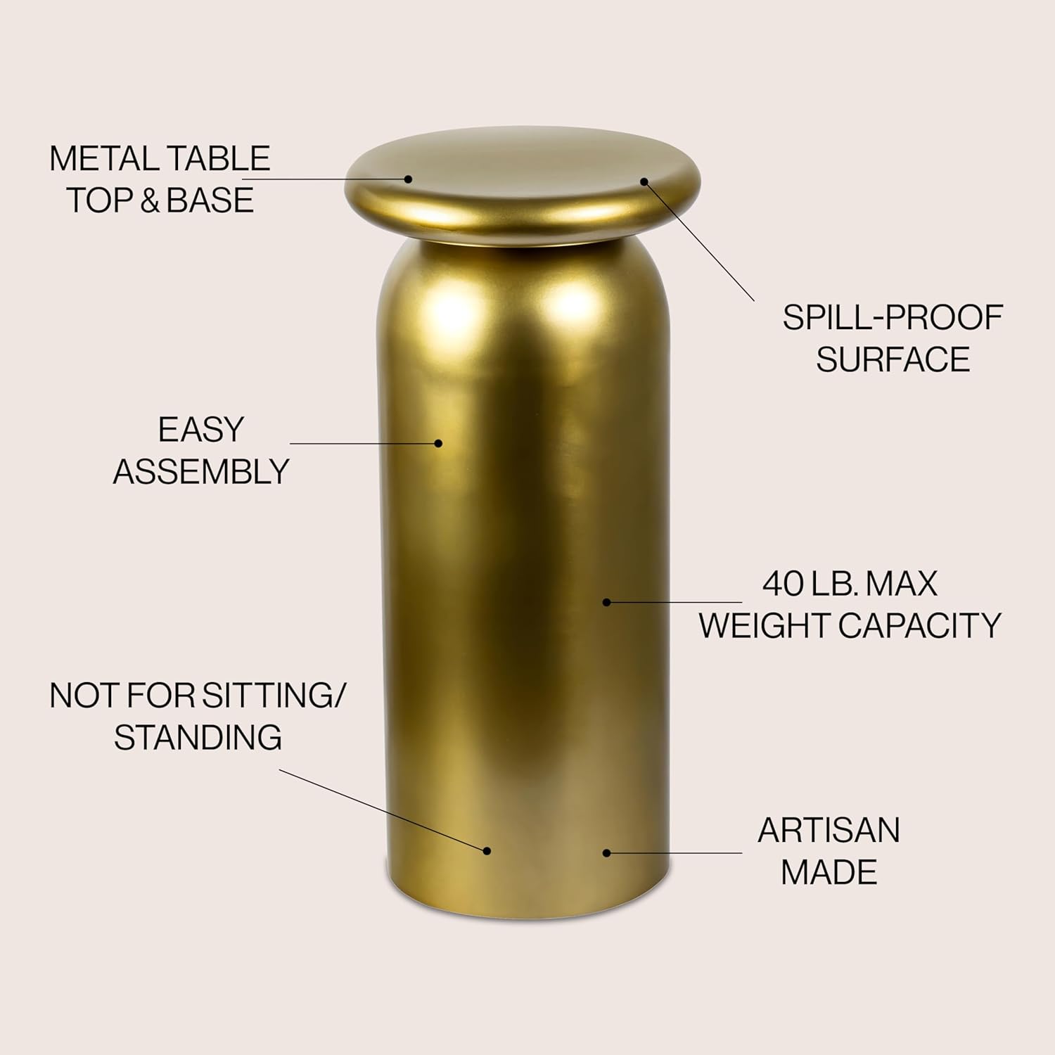 - This metal table has a semi-glossy gold painted finish