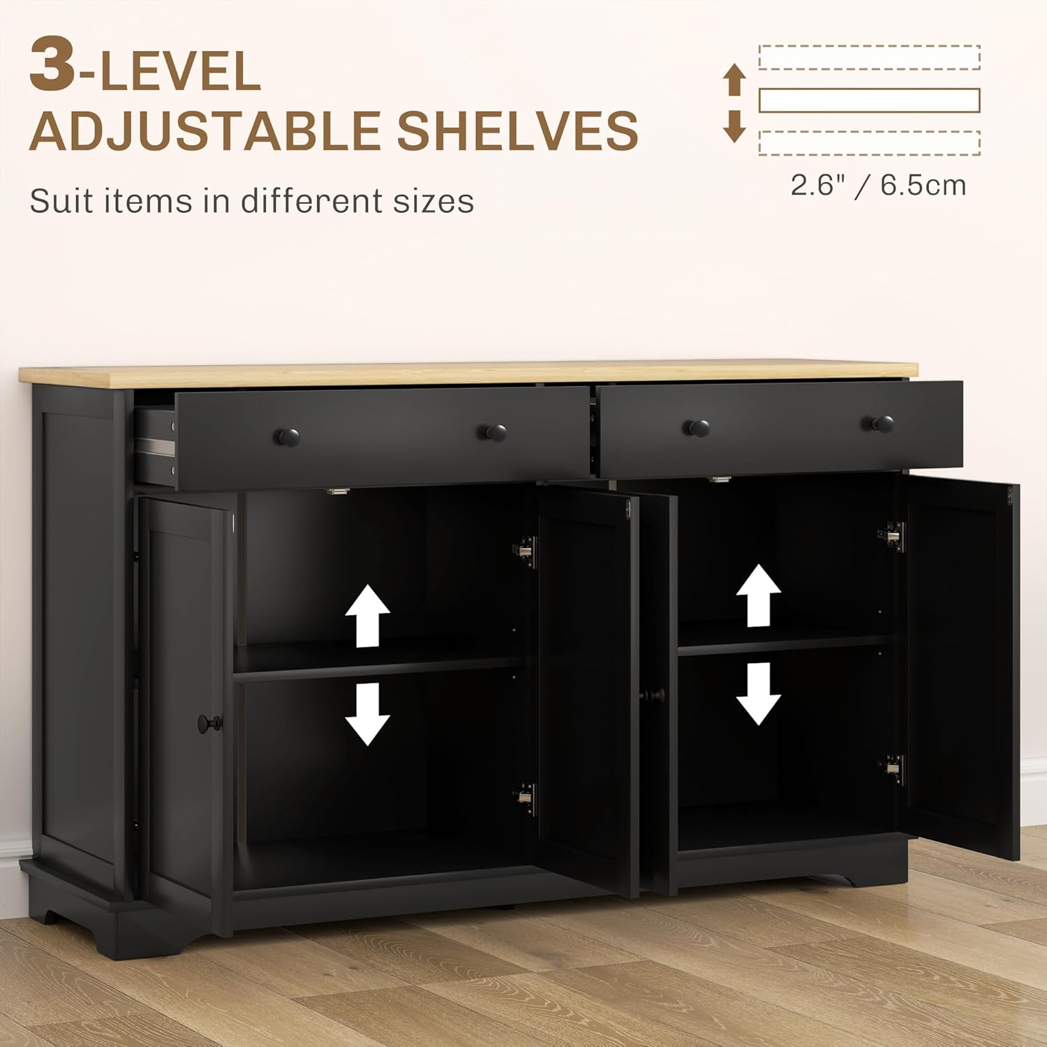 - Roomy Storage: This buffet cabinet utilizes 2 large drawers for utensils or napkins and 2-tiers offering storage space for plates, plastic containers, pots, or pans. Keep organized behind doors so your items stay safe and dust-free. The shelf inside is 3-level adjustable to meet various storage needs.
