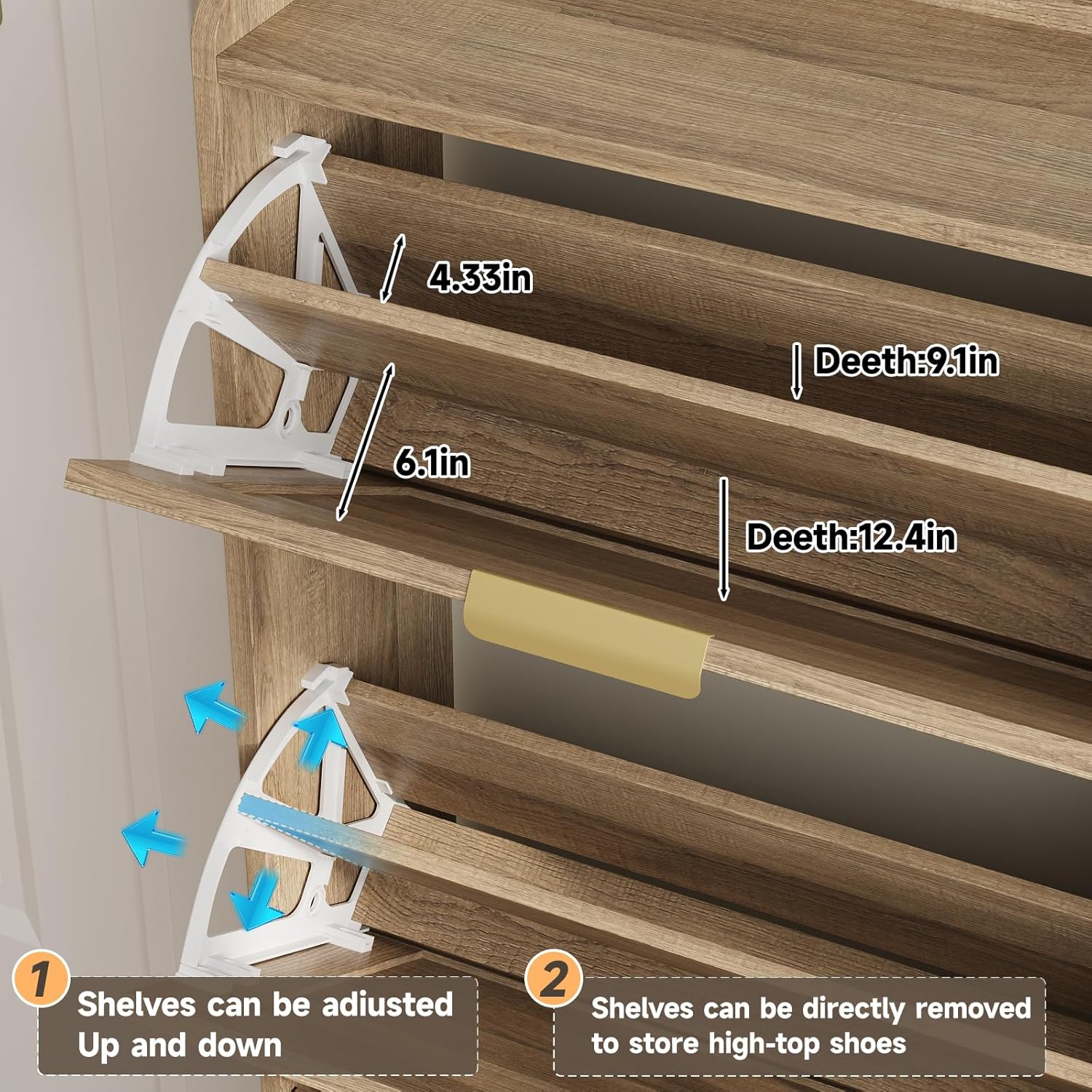 - Safe and Reliable Quality: This slim shoe cabinet contains an anti-tipping device, which can be fixed on the wall to prevent tipping and protect children's safety. Made of high-quality MDF wood, the stable structure ensures super load-bearing capacity. The hidden golden handle is simple and elegant, feels comfortable, and prevents scratches and injuries during use. It can be easily cleaned with a damp cloth