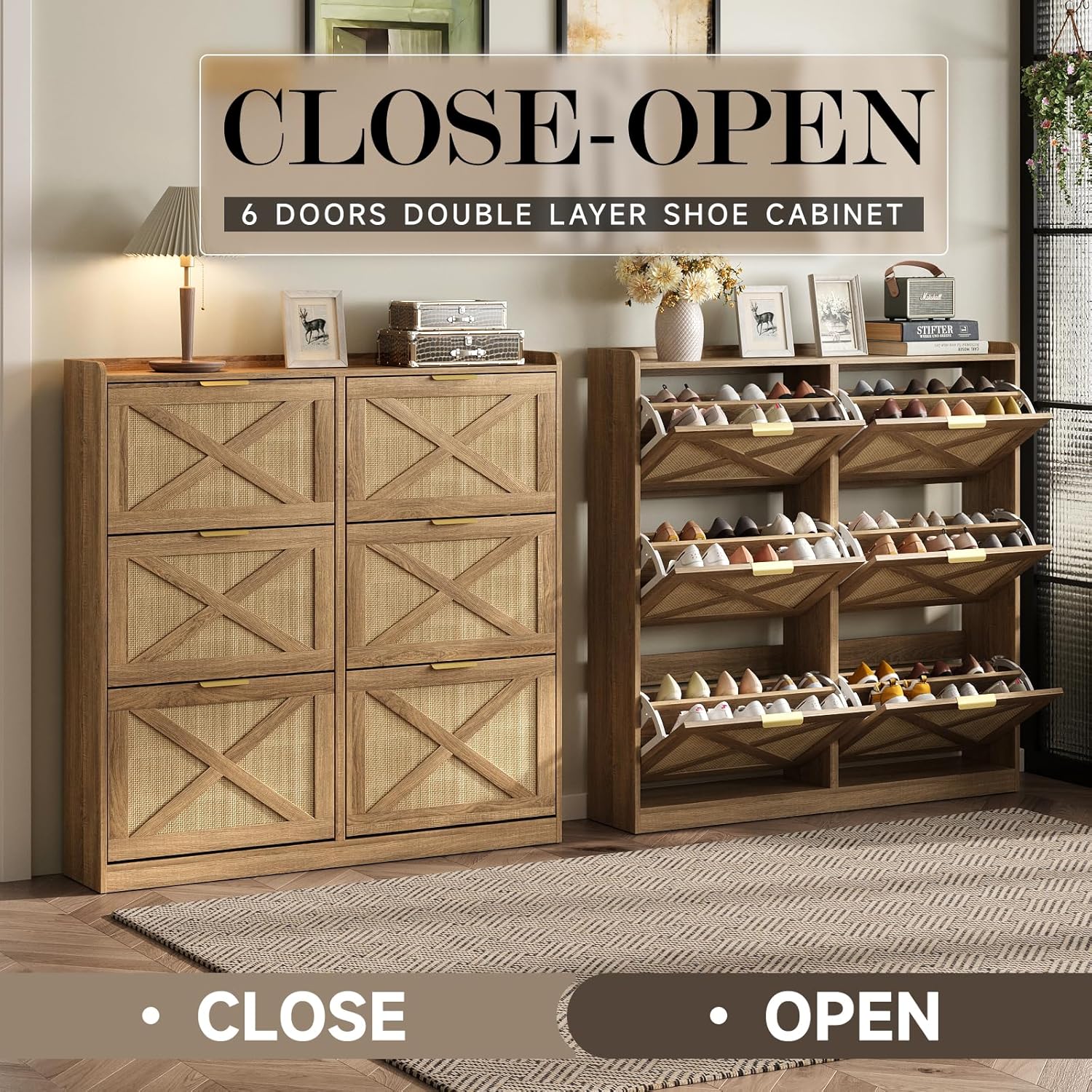 - Entryway Shoe Cabinet: The hidden shoe storage cabinet with 6 rattan flip doors, stylish and simple rustic oak rattan makes it a neat and beautiful finish and looks great in many different home styles. Perfect for placing in the entryway, hallway, living room, or porch, provides a neat looking in your home and space saving