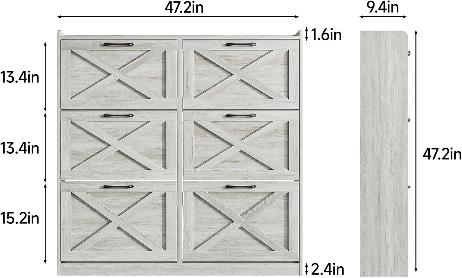 - Large Capacity Shoe Cabinet: The drawer shoe cabinet can store up to 36-48 pairs. There are 6 upper and lower drawers, each drawer contains two layers of storage space. The panel can be adjusted or removed in two grooves to accommodate different heights and sizes of flats, mid boots or heels! There is a fence on the top, ideal for placing potted plants, ornaments, socks and keys, without worrying about falling