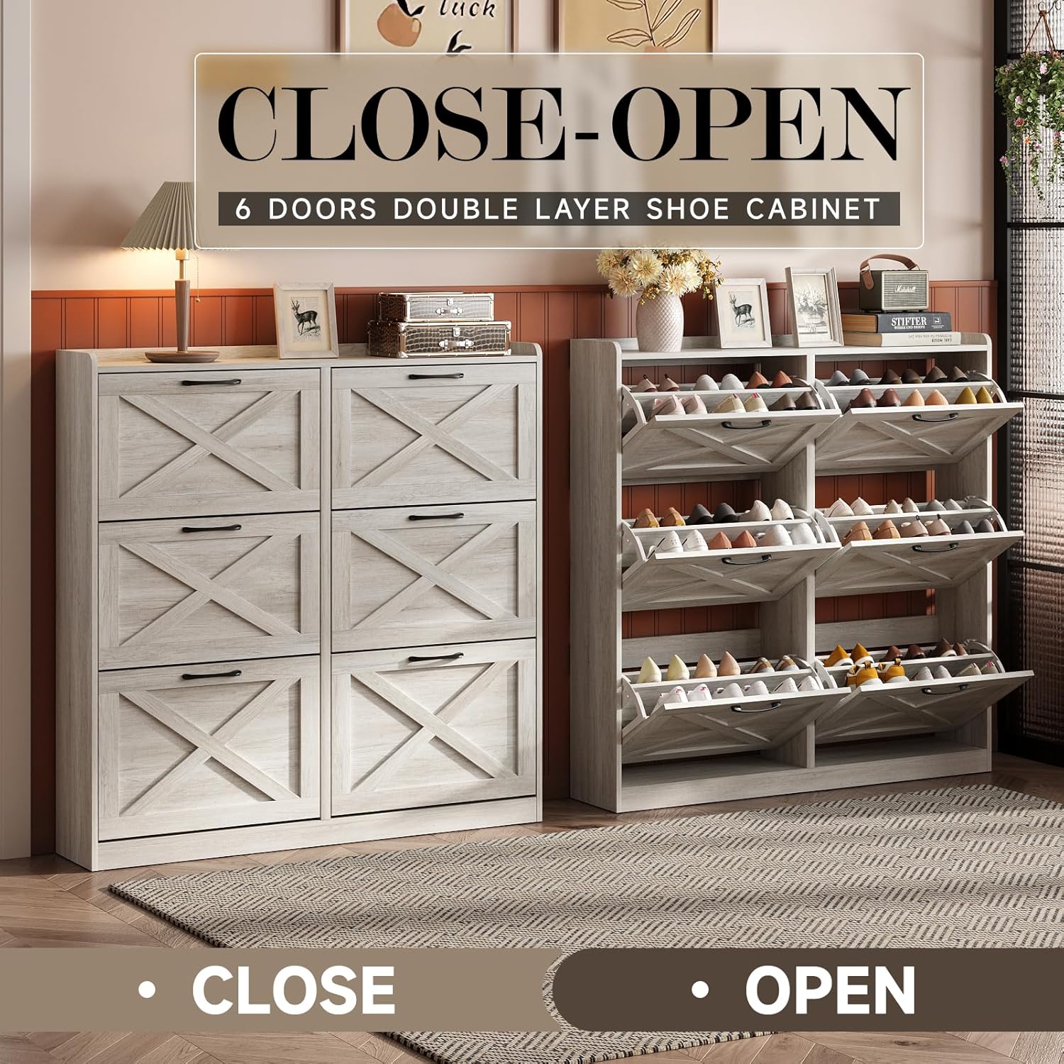 - Entryway Shoe Cabinet: The hidden shoe storage cabinet with 6 flip doors, stylish and simple beige makes it a neat and beautiful finish and looks great in many different home styles. Perfect for placing in the entryway, hallway, living room, or porch, provides a neat looking in your home and space saving