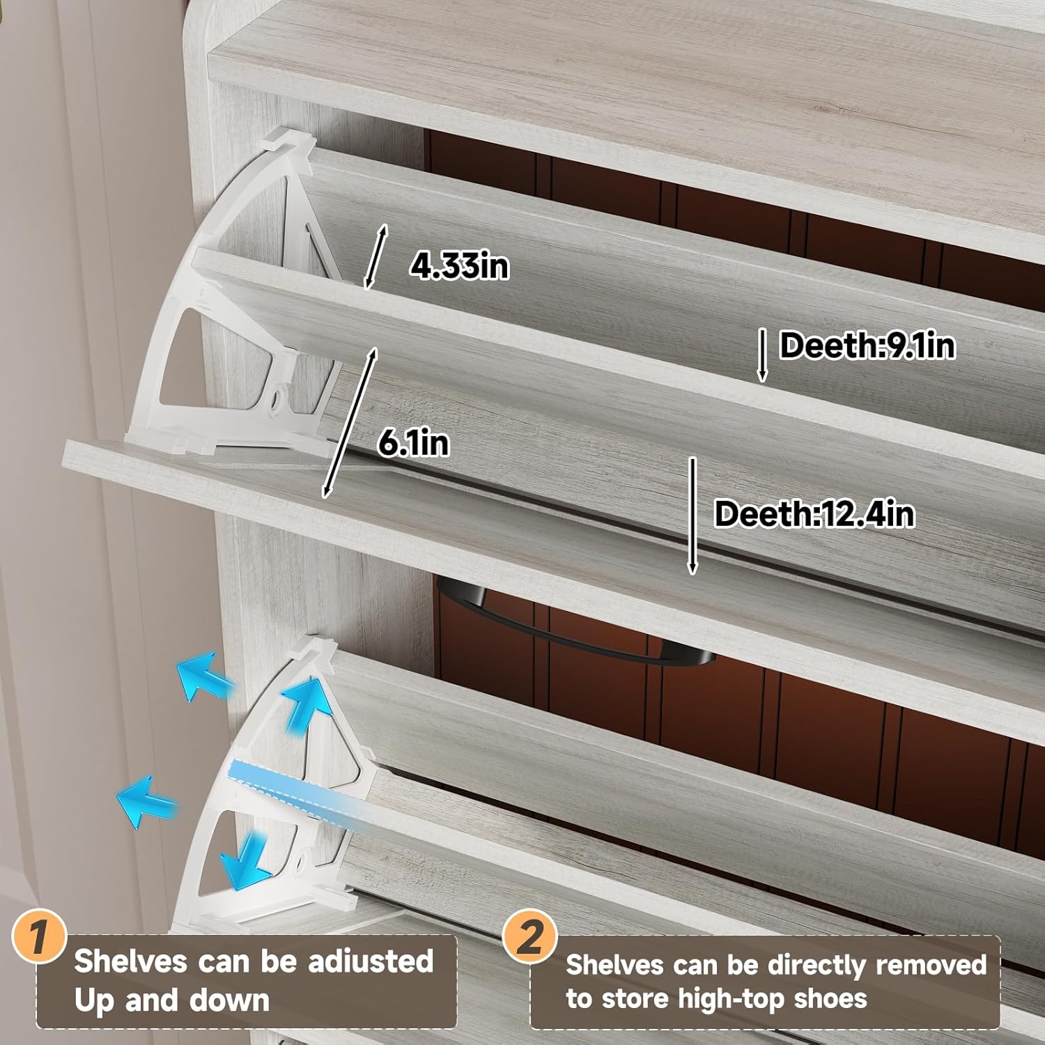 - Narrow Shoe Cabinet: Most other shoe cabinets have a depth of 14-15in, while our slim shoe cabinet depth front to back is 9.35in! Only half the volume of other shoe cabinets, but it can neatly hide and store more and larger shoes! Innovative flip space-saving design, bringing more space in the entry area or hallway