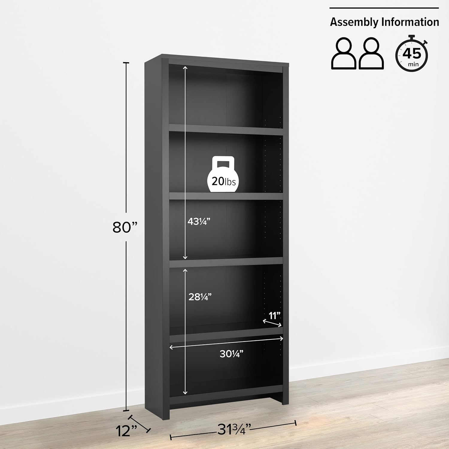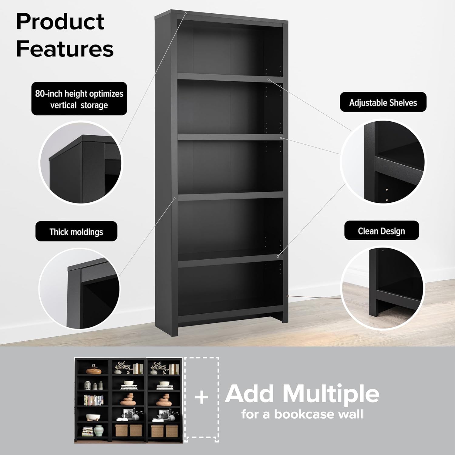 Prepac Moda 5-Tier Tall Wooden Bookcase, Black Storage Cabinet, Display Cabinet, Bookshelf with Storage Shelves 31.75" W x 80" H x 12" D for Home Office, Living Room, Bedroom Organizer