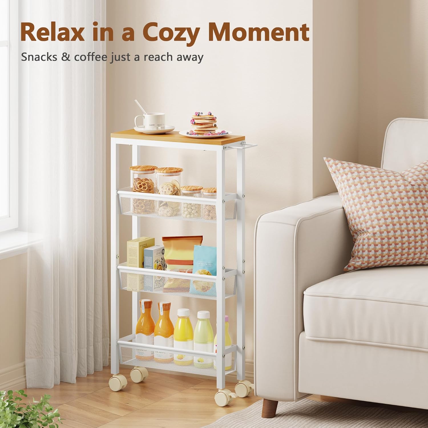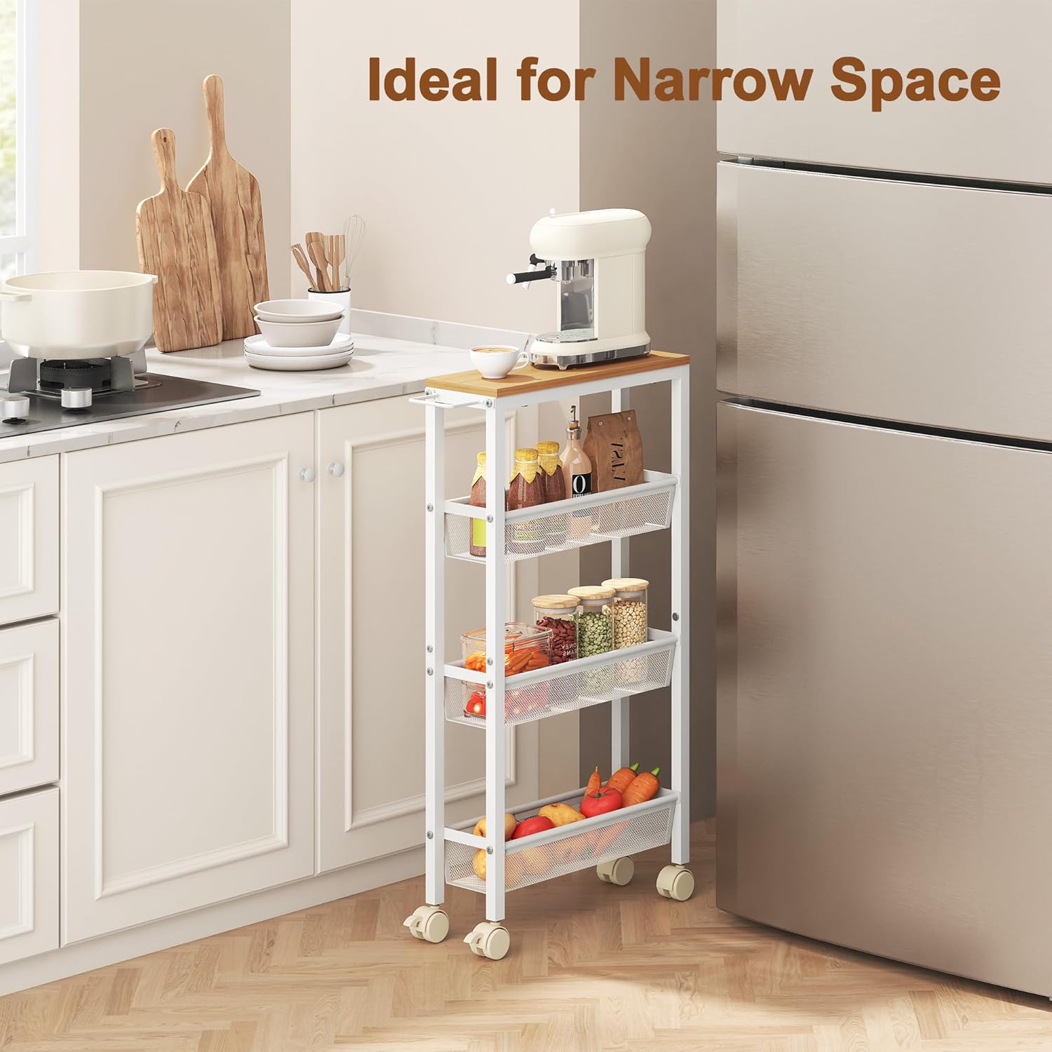 Hoctieon Slim Rolling Storage Cart, 4-Tier Narrow Kitchen Storage Cart with Handle & Wheels, Mobile Shelving Unit, Wooden Top & Metal Frame, Utility Cart for Kitchen, Small Spaces, Oak Beige