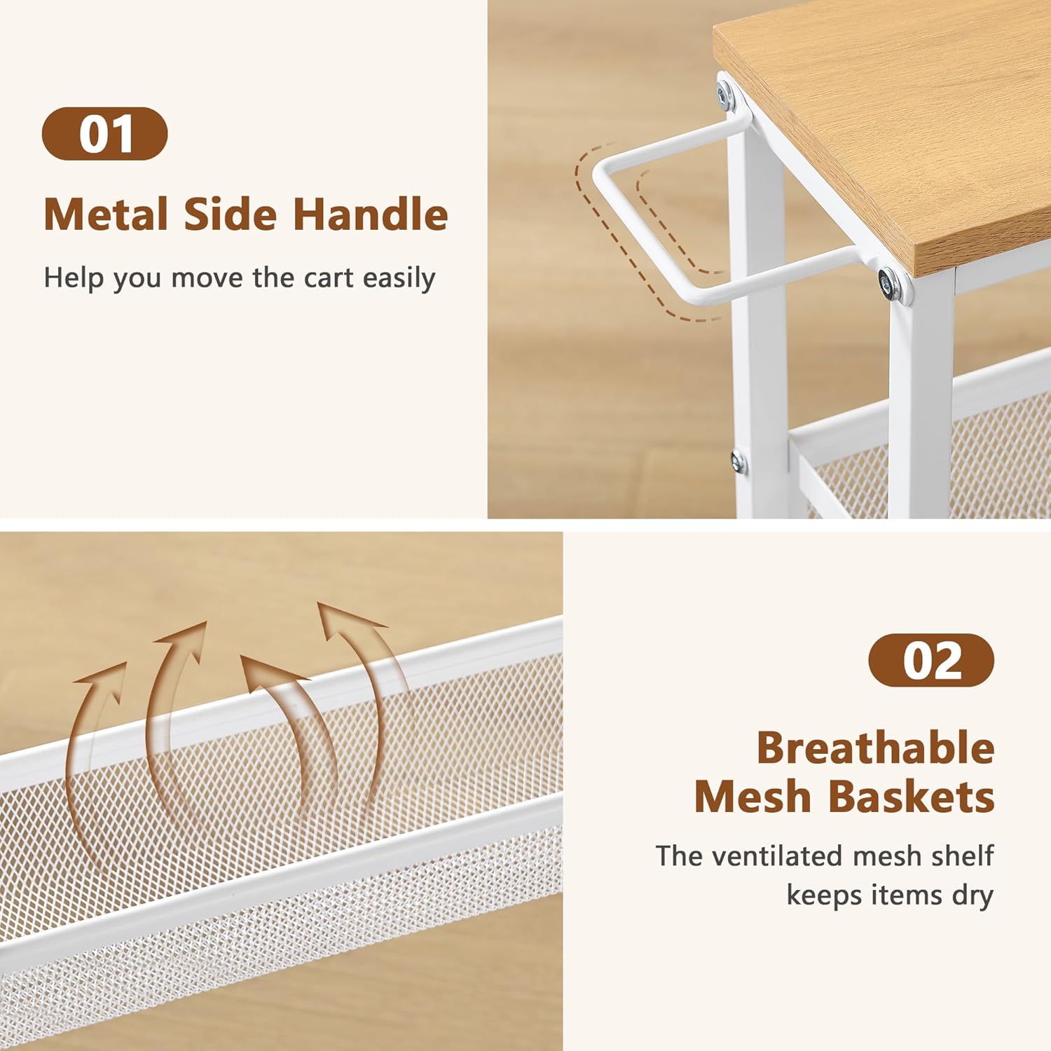 - KITCHEN STORAGE CART: 4 shelves made of metal material and wooden boards, easy to clean and durable. Shelves are fitted with wire shelves and are hollowed out for easy drainage. The top shelf can safely hold approximately 60-110lbs of heavy items and the bottom 3 tiers of storage baskets have a maximum weight capacity of 22-45lbs, perfect for your family's storage needs.