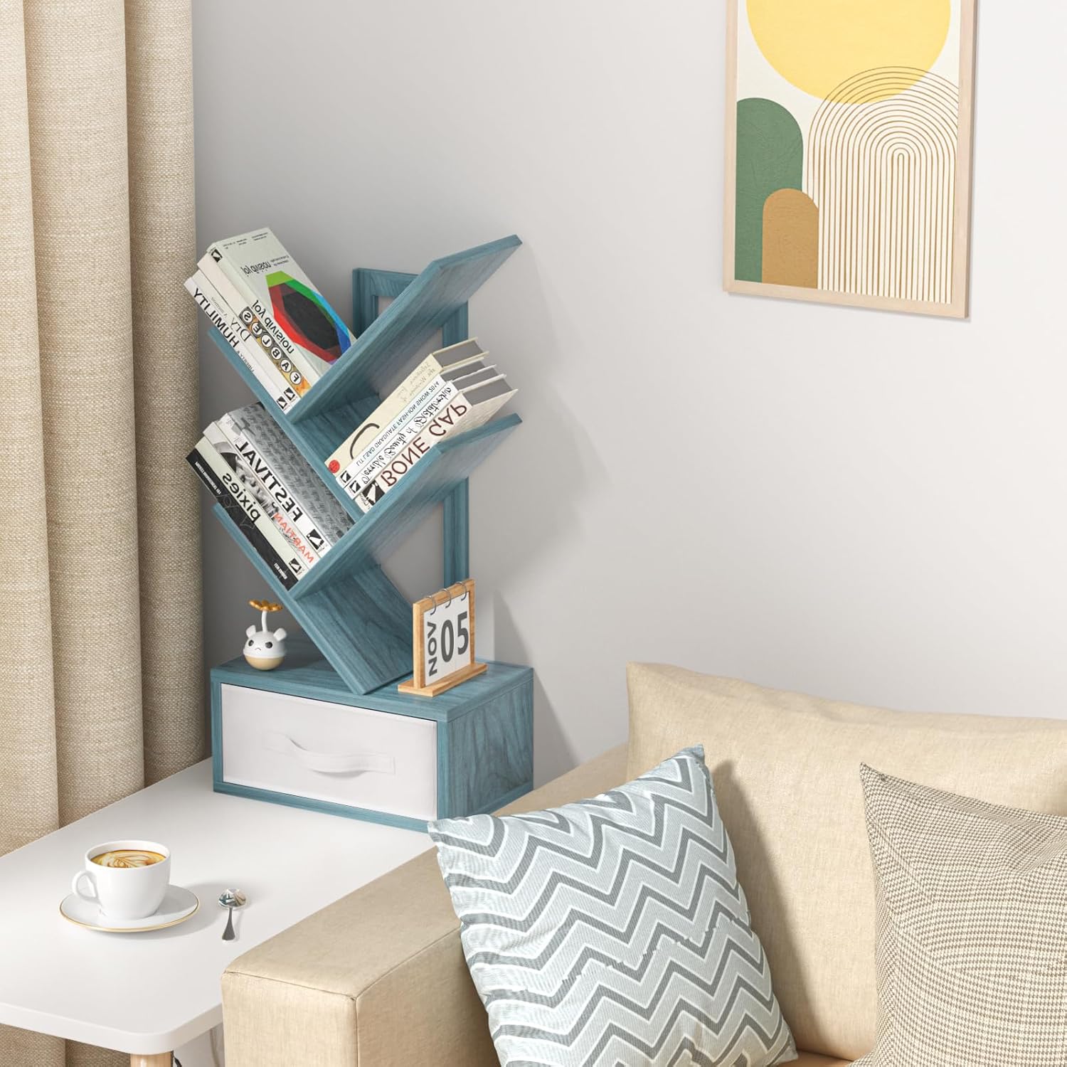 Small Book Shelf with Drawer,4 Tier Black Tree Bookshelf,Blue Desktop Bookcase,Modern Desk Display Storage Bookshelves,Floor Standing Organizer Bookcases for Living Room,Bedroom,Office