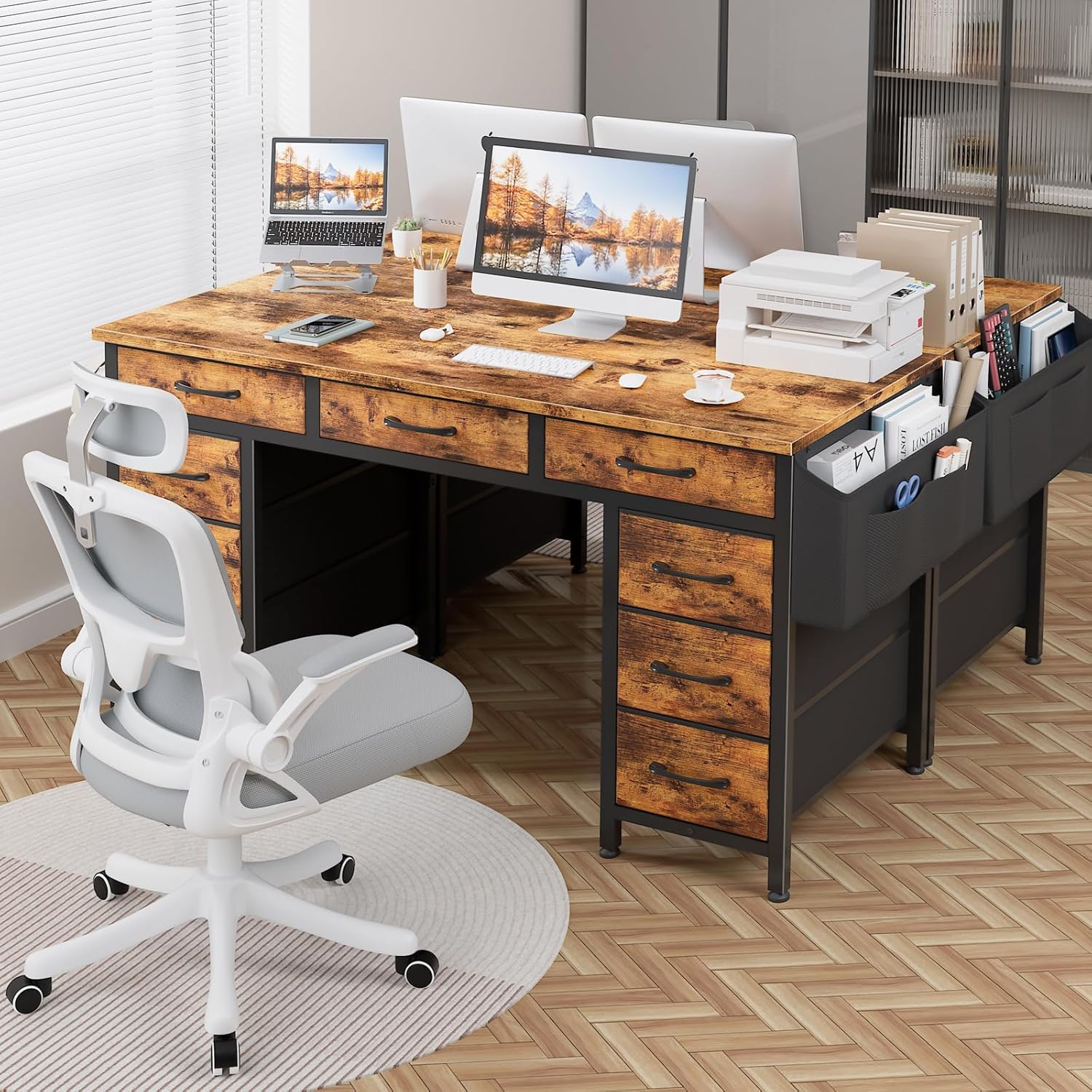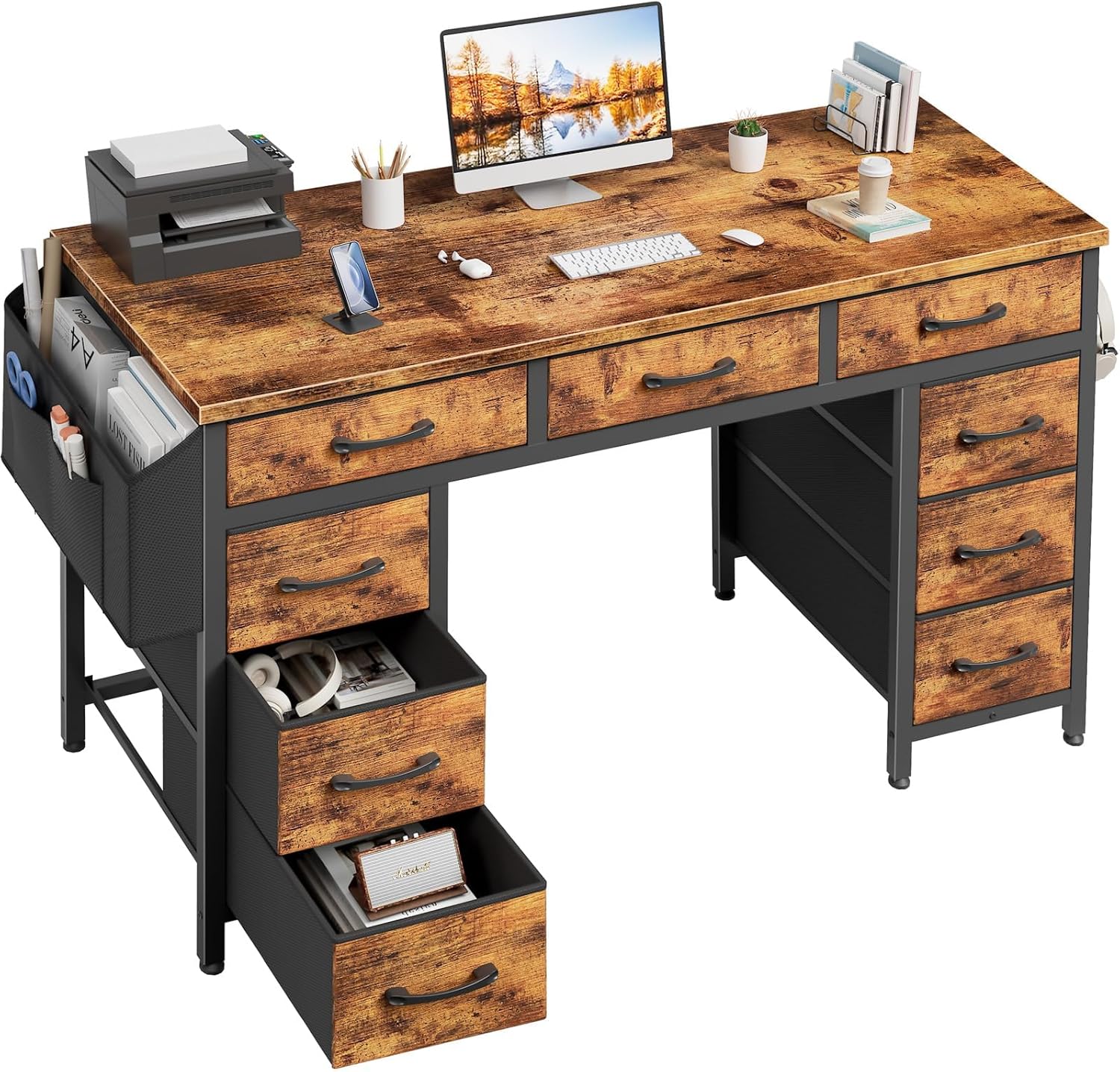 Lufeiya 47 Inch Computer Desk with 9 Drawers, Office Desk Work Desk for Home Office, Study, Writing Desk with Fabric Drawers on Both Sides, Large Storage, Rustic Brown