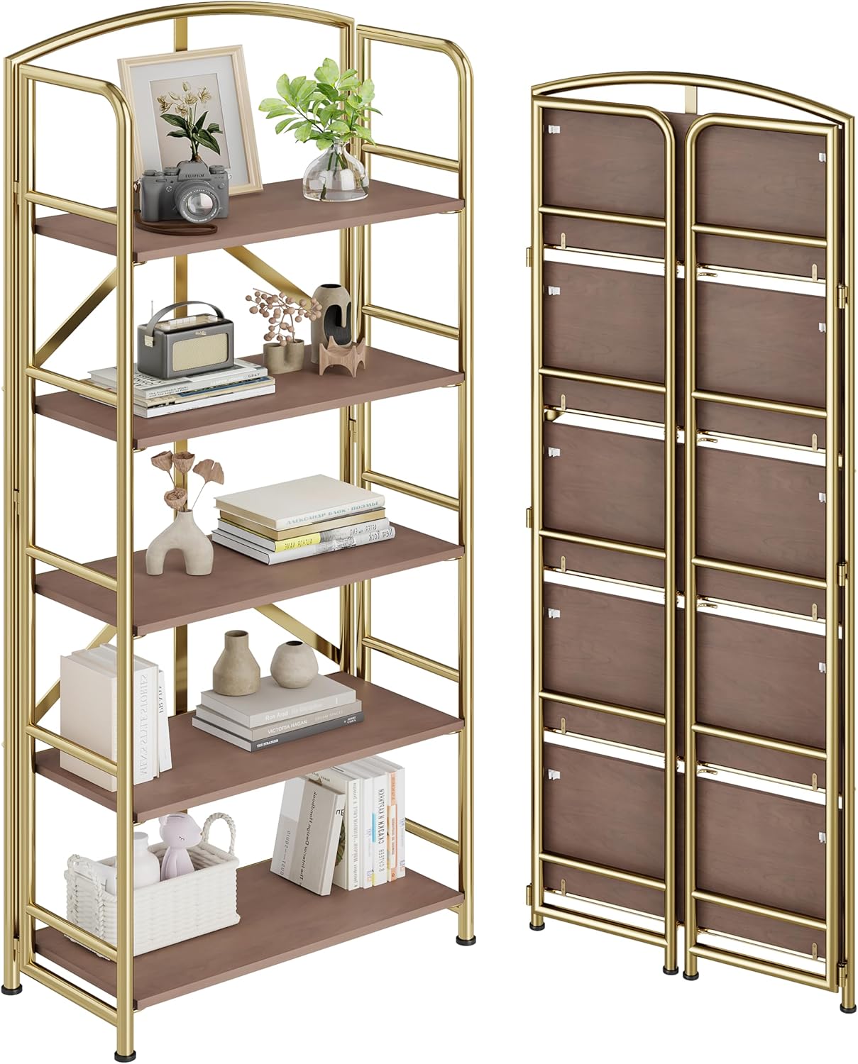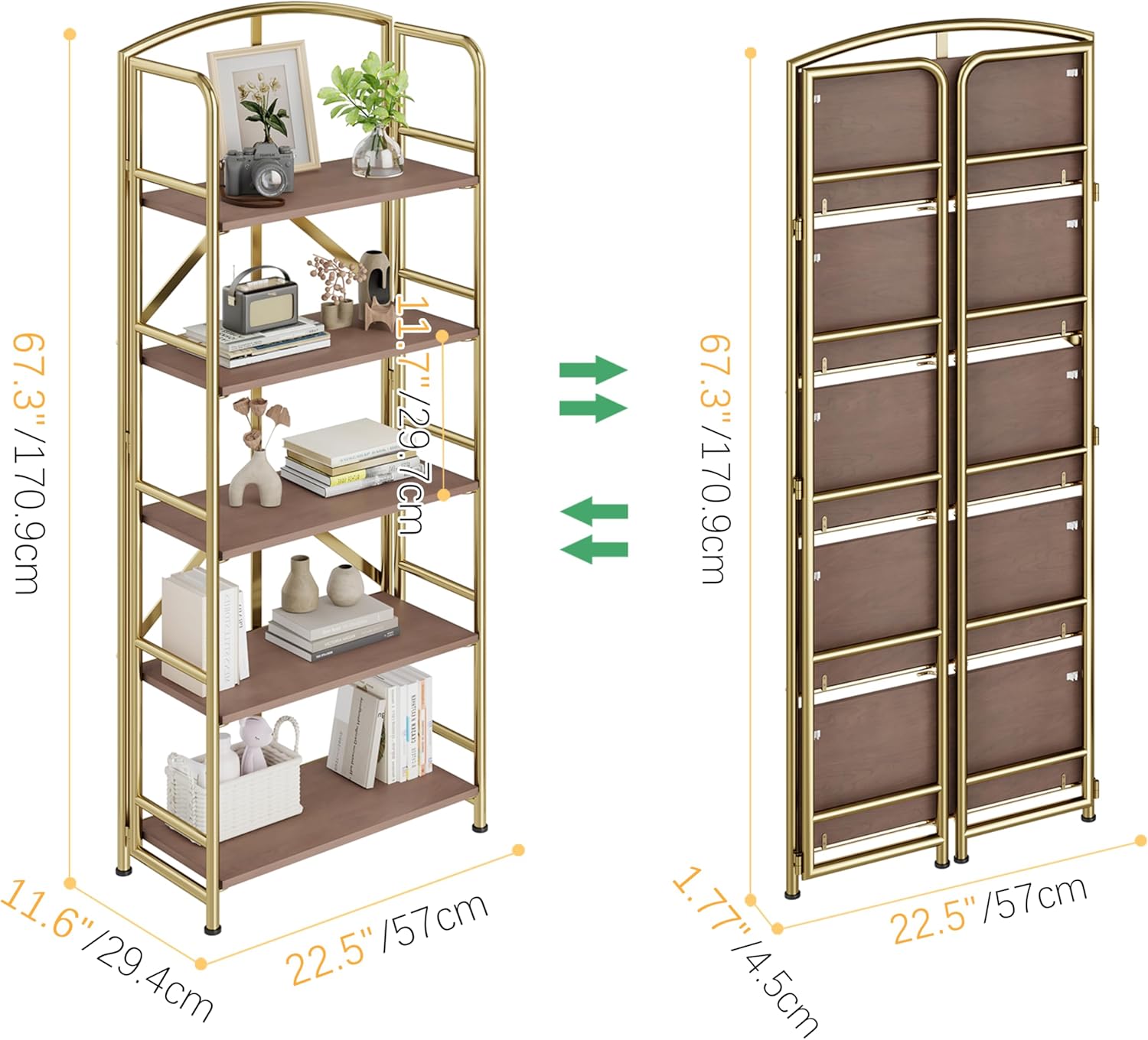 No-Assembly Folding Gold Bookshelf Storage Shelves 5 Tiers Vintage Multifunctional Plant Flower Stand Storage Rack Shelves Bookcase for Home Office