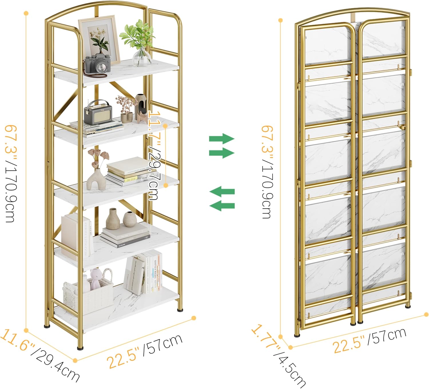 - Storage Shelf Dimension: Folding Storage Bookcase Folded Size 67.3''H x 22.5''W x 1.77''D, Expanded Size 67.3''H x 22.5''W x 11.6''D.