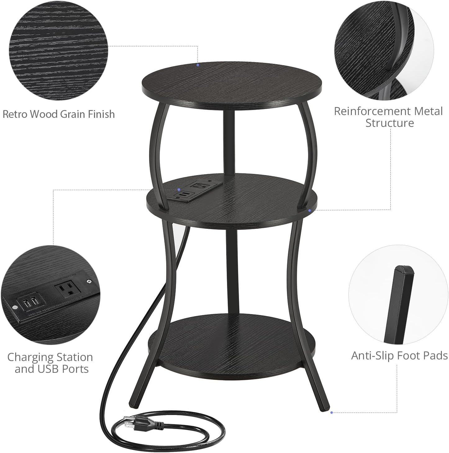 - 【Small Round Side Table with Charging Station】 This 3-tier round table nightstand has 2 built-in standard AC outlets (120Vmax/12A max), 2 USB ports (5V/2A max) and a 4.9ft power cord, enough for charging needs, it can easily charge your phone, laptop and tablet, or plug in a light. Great table for storage and charging.