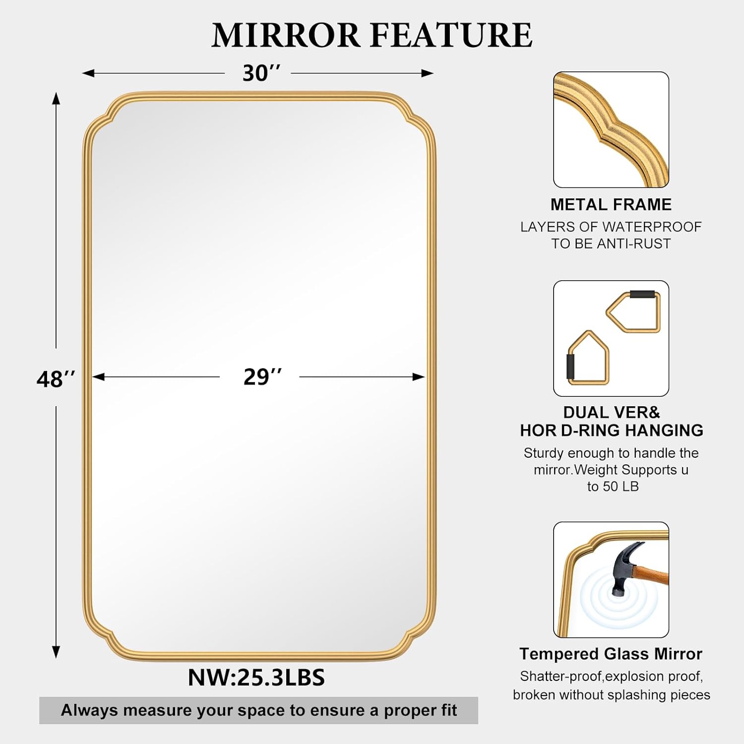 - 【30" x 48" Large Size】: 30" x 48" size is large enough for you to see entire figure. If you wish to add a bit of sophistication to your home, the gold wall mirror will not disappoint you. That will raise the level of decor.