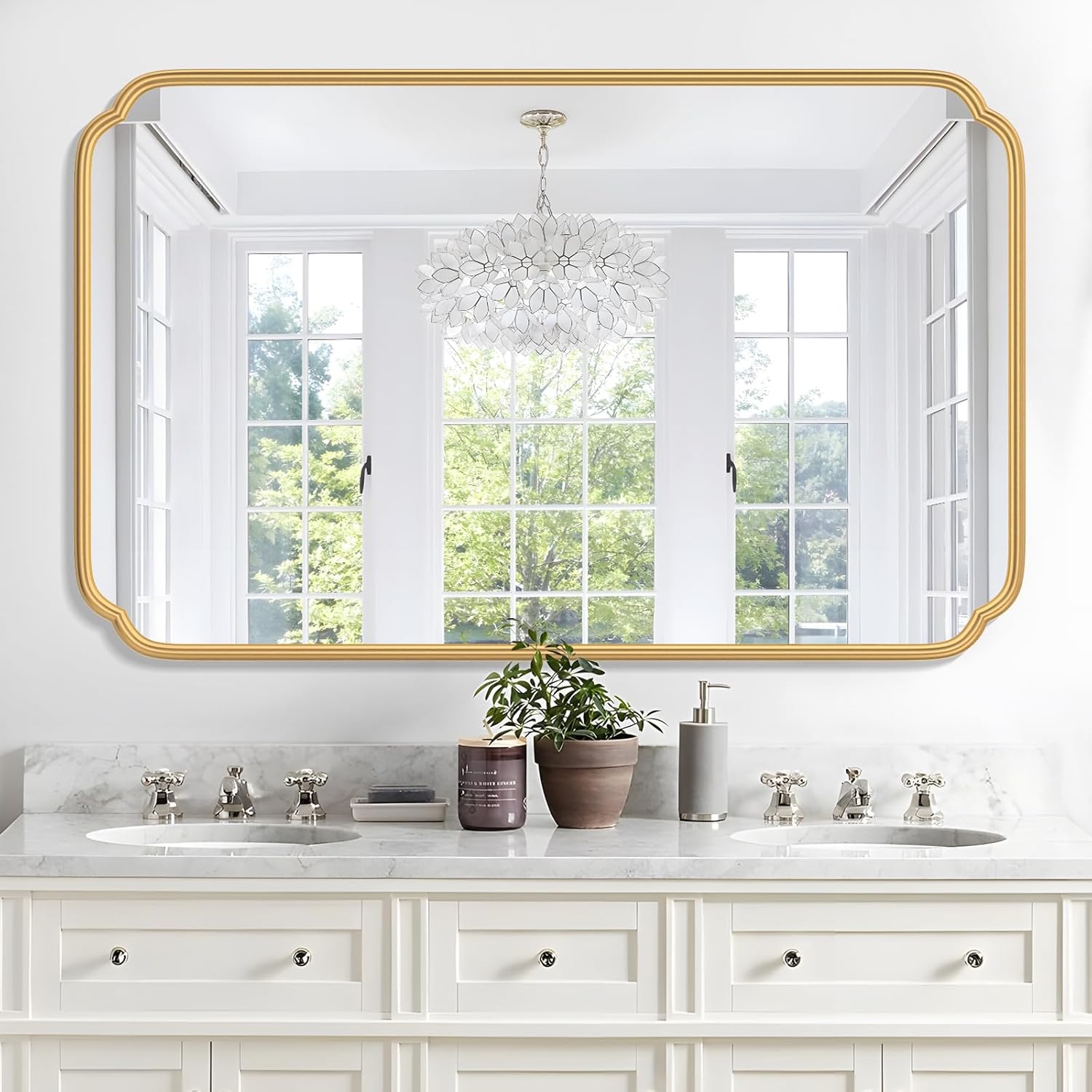 - 【A Unique Elegant-Looking Mirror 】:The gold bathroom mirror, overall design and the sleekness of the curves in the frame and it adds a classiness as opposed to a boring straight square mirror. A very versatile mirror that will raise the level of decor anywhere in the house. The rounded corners mirror is classic and will never go out of style.