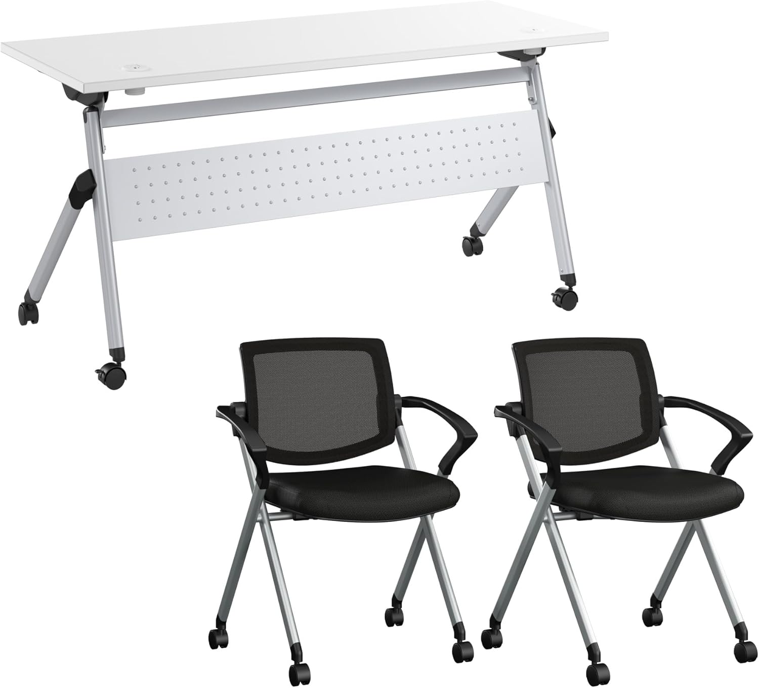 - VERSATILE DESIGN: Folding Training Table is designed to be set up quickly and reconfigured at a moment's notice, ideal for offices or classrooms, while the chairs stack for space-saving storage. Armrests are ergonomically contoured and finished with durable polypropylene, while breathable nylon mesh backrest is great for staying cool in warmer environments.