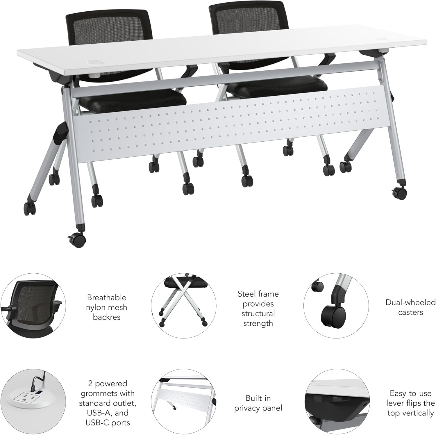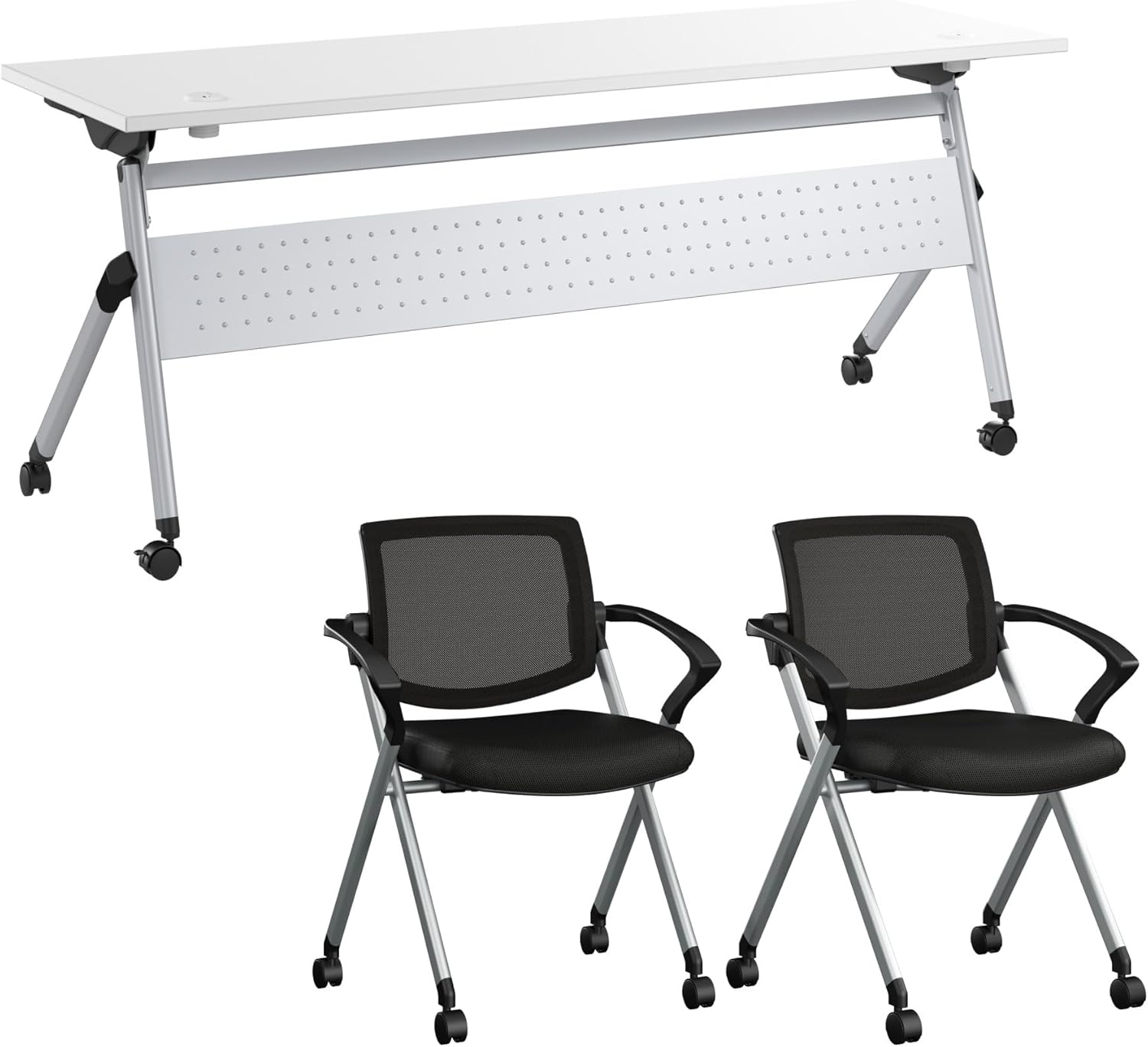 - VERSATILE DESIGN: Folding Training Table is designed to be set up quickly and reconfigured at a moment's notice, ideal for offices or classrooms, while the chairs stack for space-saving storage. Armrests are ergonomically contoured and finished with durable polypropylene, while breathable nylon mesh backrest is great for staying cool in warmer environments.