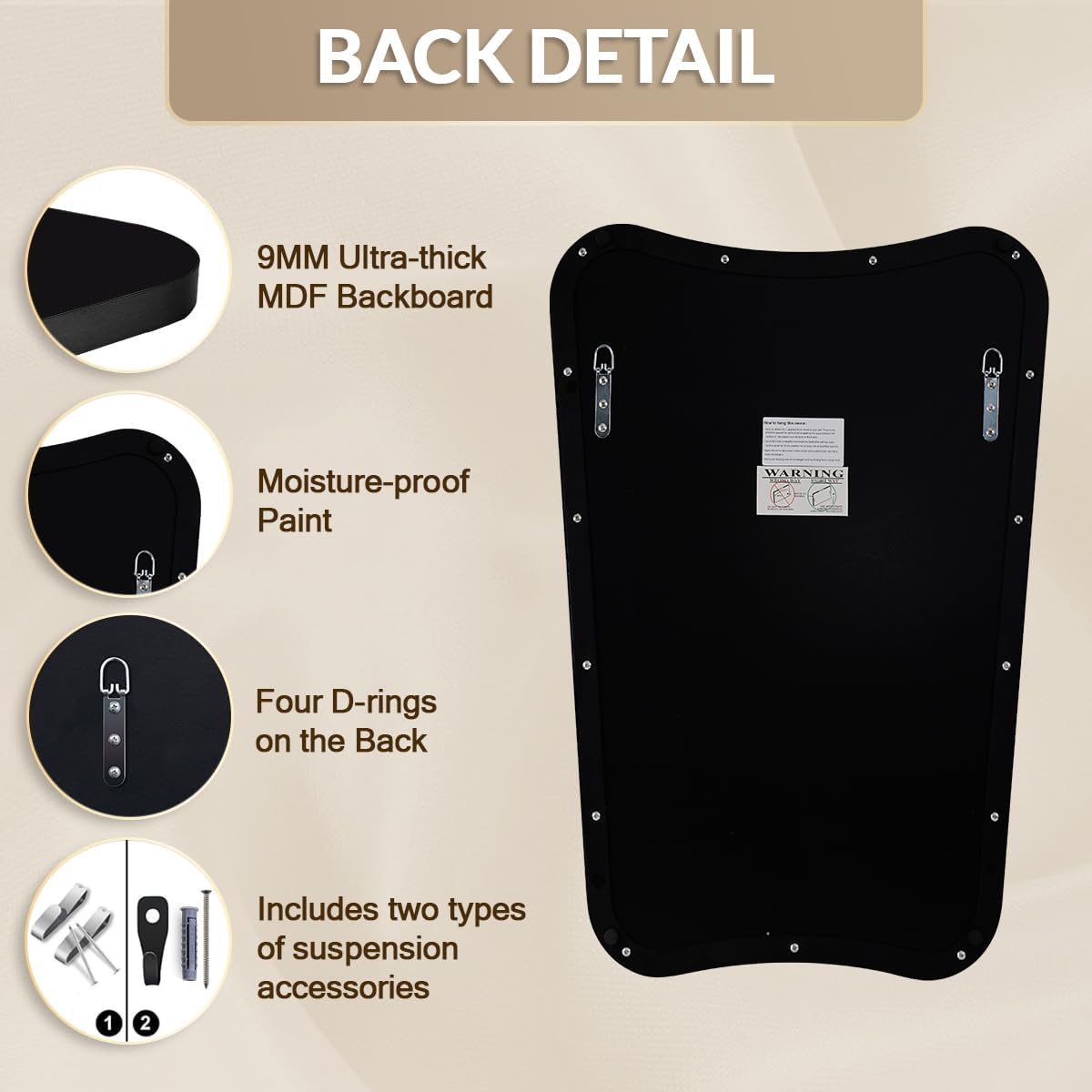 - Easy Installation: The black mirror comes with all the necessary accessories and instructions; Tips: 1. Due to its shape, it can only hang vertically; 2. It weighs 16 lb, please make sure you accept it and carefully check the size before your purchase