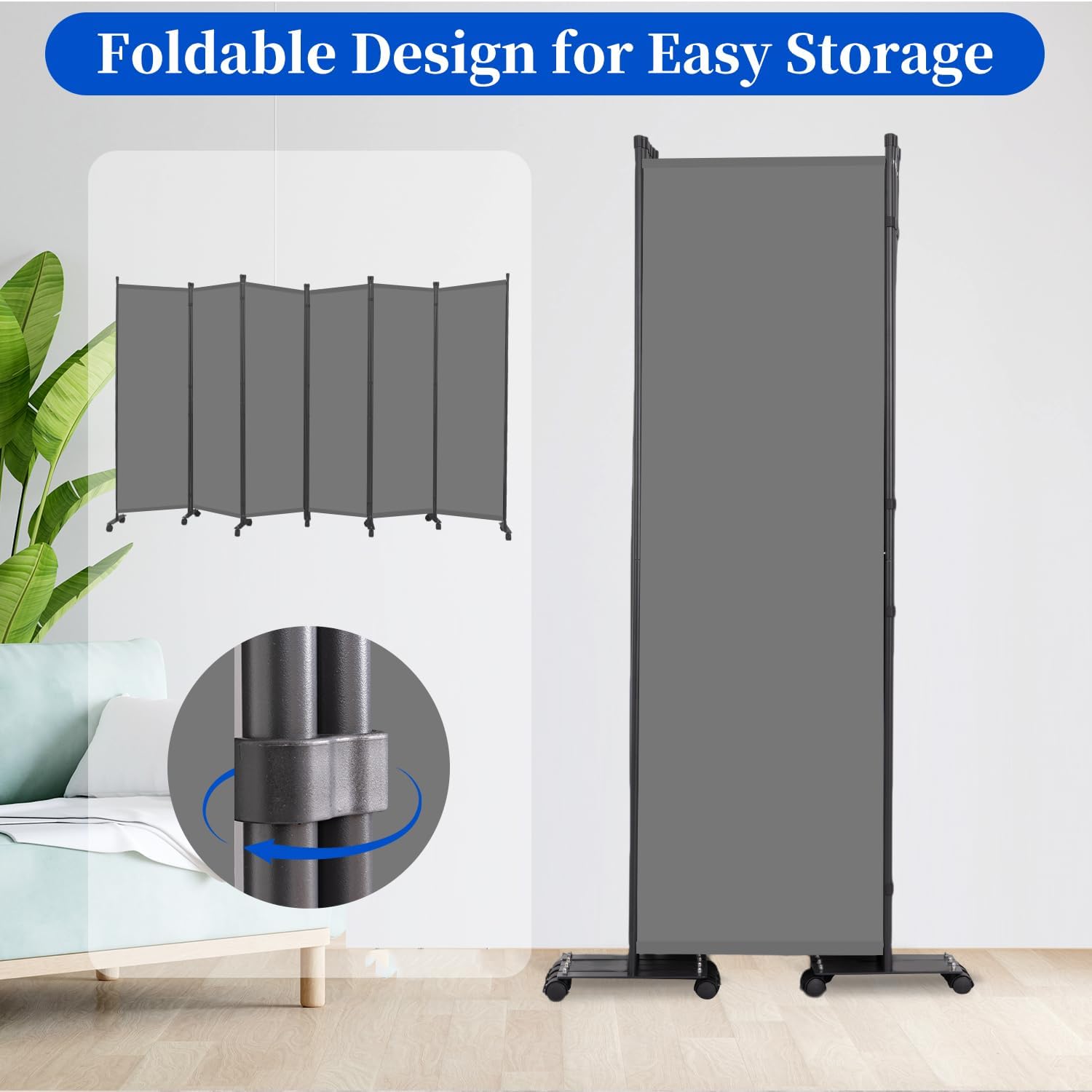 Room Divider 6FT Room Partition with Lockable Wheels, 6 Panel (Thicked Metal Base) Room Dividers, Freestanding Indoor Folding Privacy Screens, Portable Fabric Wall Divider for Room Separation, Grey
