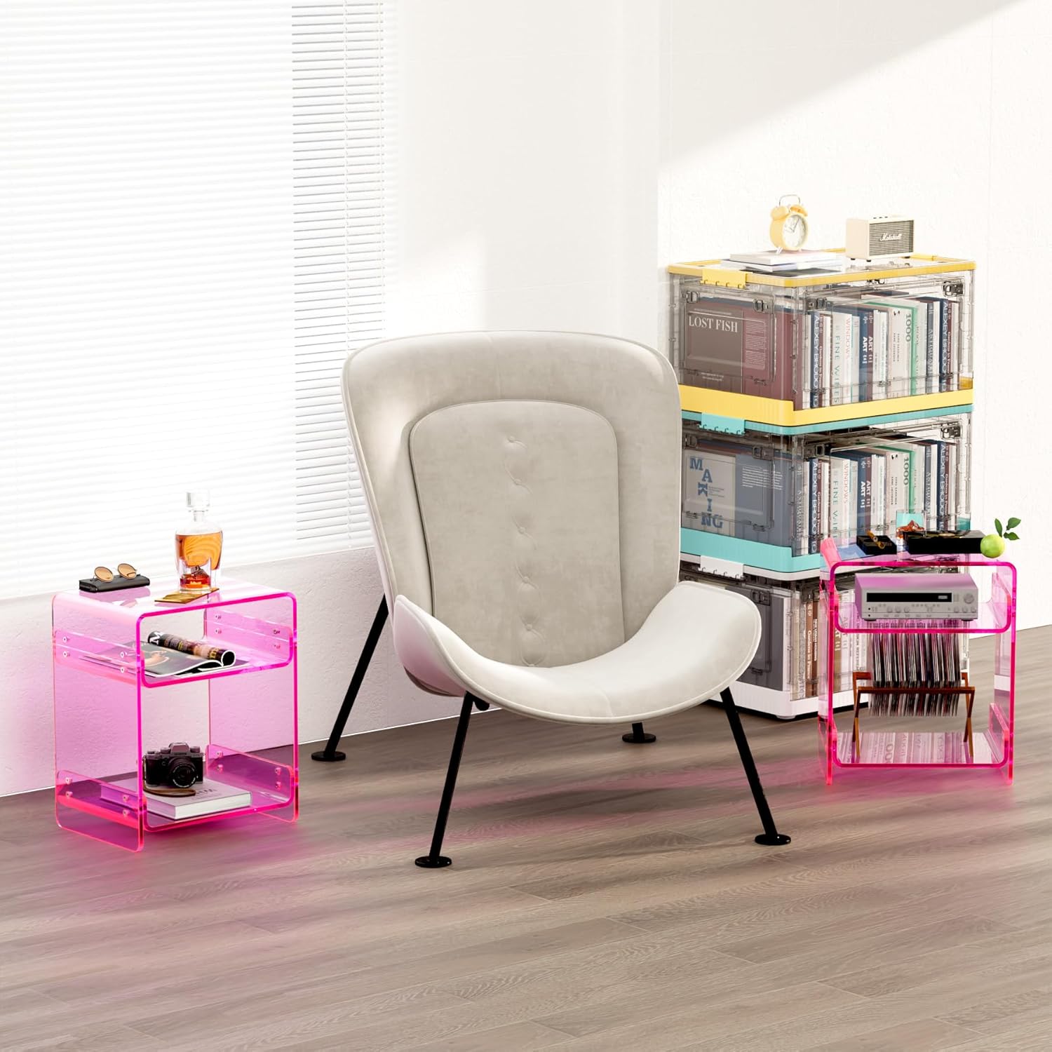 - 【Ample Dual-Shelf Storage】This acrylic side table with shelves features two spacious cube shelves, providing ample room to store books, magazines, decor, or daily essentials. It works perfectly as a modern storage table, minimalist nightstand, or multi-functional bedside organizer. Its clear acrylic storage design ensures your items stay visible while maintaining a clean, modern aesthetic. Perfect for displaying collectibles, candles, photo frames, or even small electronics like a lamp or clock radio.