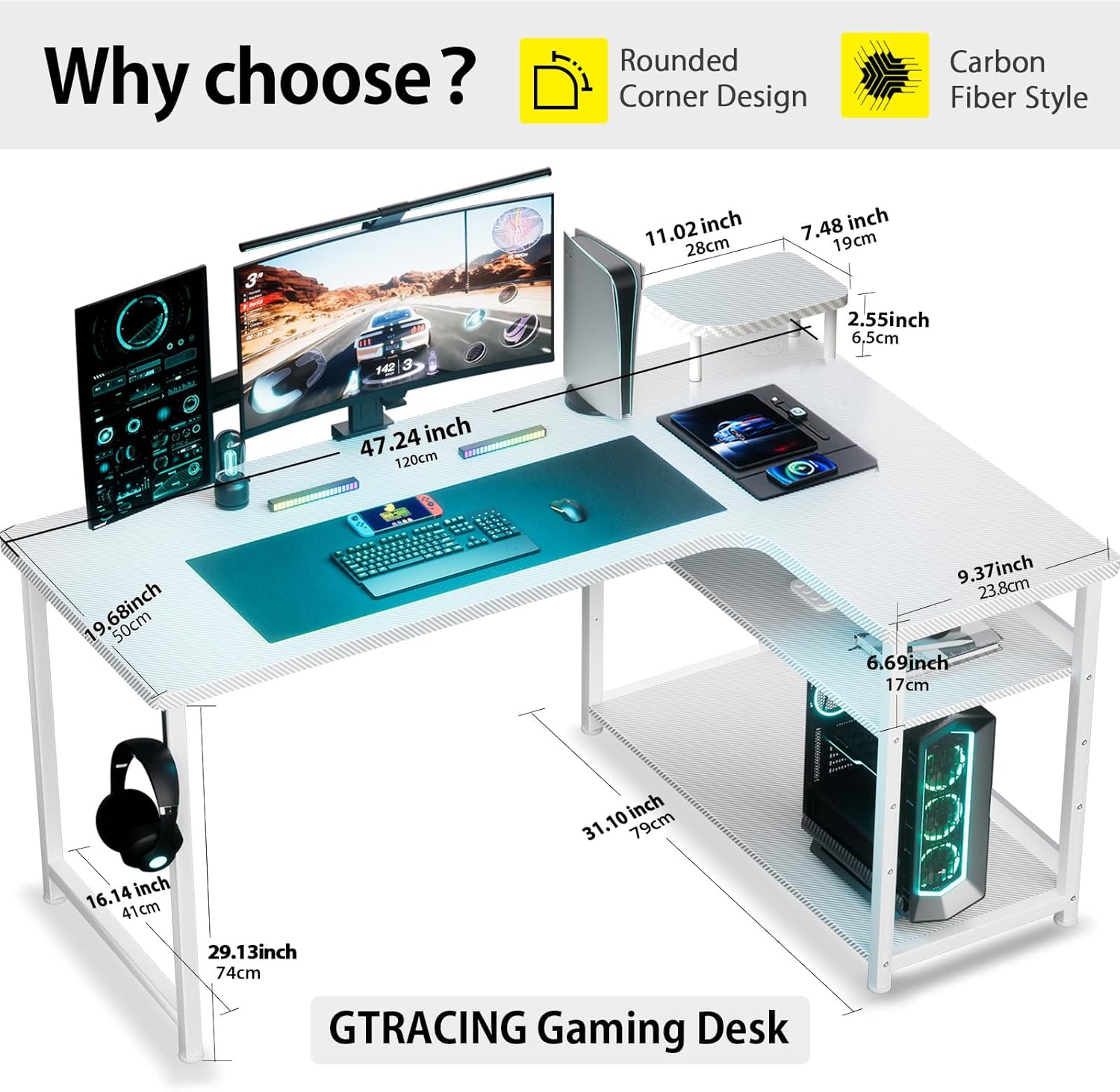 GTRACING Gaming Desk L Shaped Desk Carbon Fiber Style Computer Desks Compatible with Monitor Arm Storage Shelves Corner Desk Gaming Table for Home Office Desks Easy to Assemble Adjustable Shelf Height