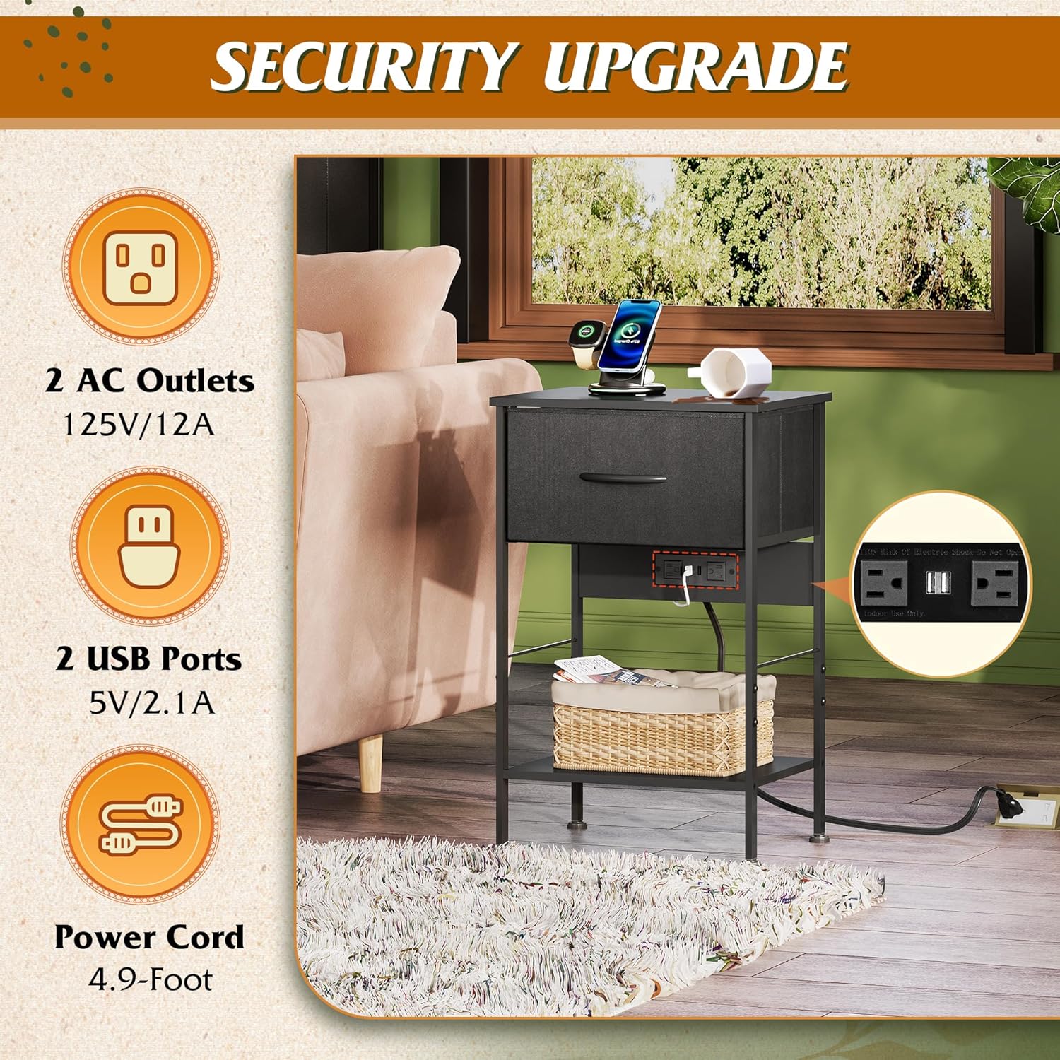 WLIVE Night Stand with Charger Station, Small Nightstand with 1 Fabric Drawer and Open Wood Shelf, 25" H Bedside Table for Bedroom, 2-Tier Storage Side Table for Dorm, Entryway, Black