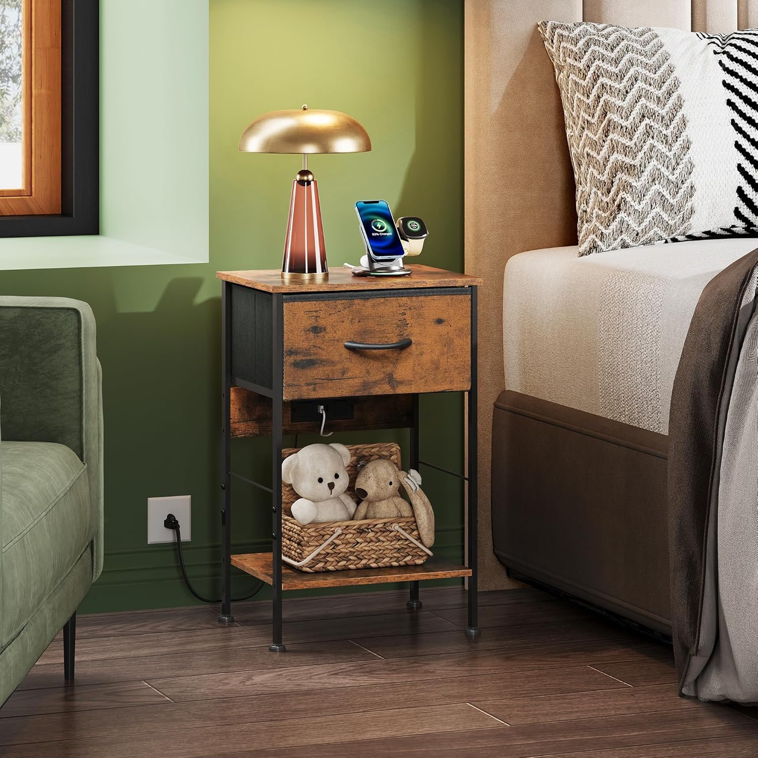 WLIVE Night Stand with Charging Station, Small Nightstand with Fabric Drawer and Open Shelf, 25" H Bedside Table for Bedroom, 2-Tier Storage End Tables, Dresser for Dorm, Entryway, Rustic Brown
