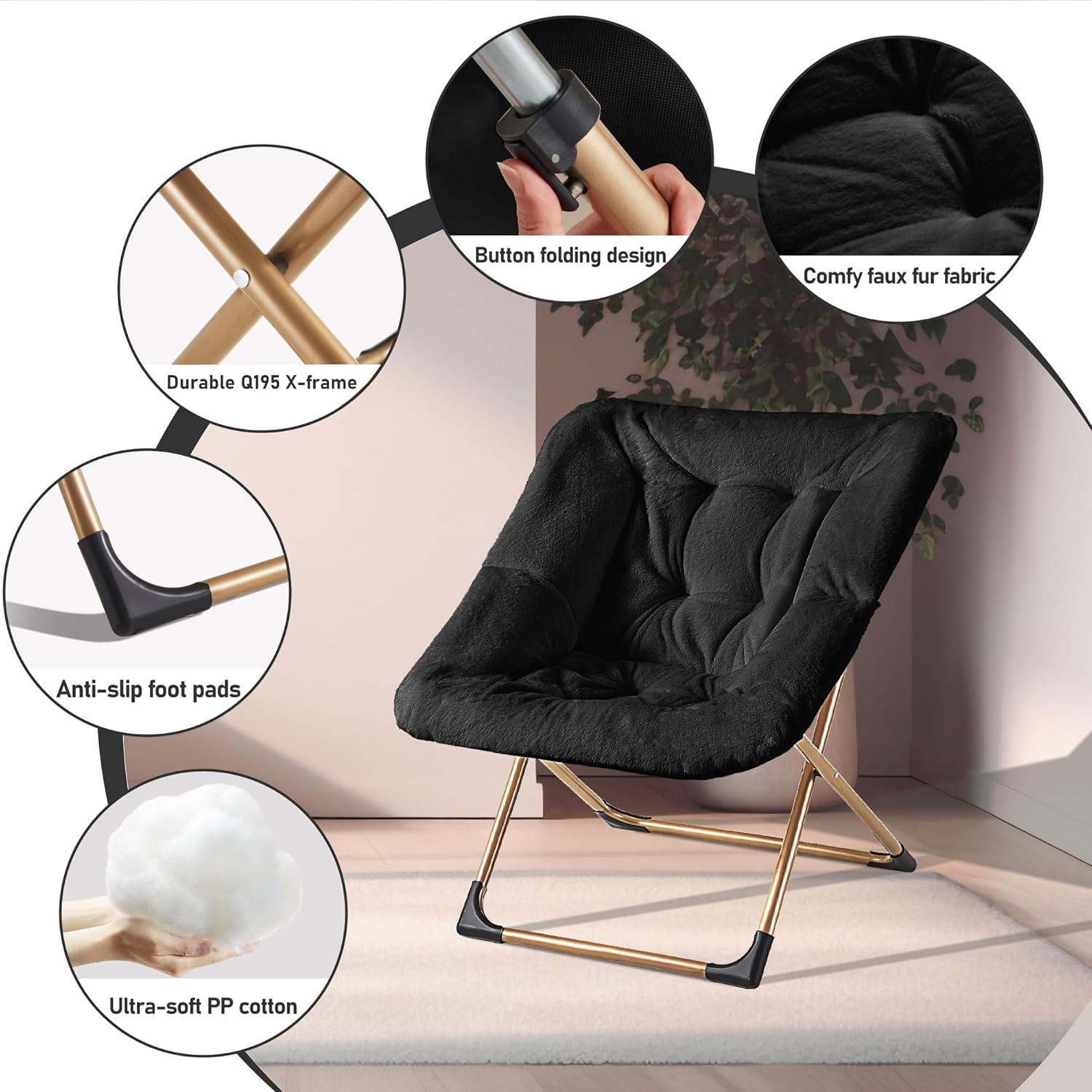 Comfy Oversized Saucer Chair, Soft Faux Fur Reading Lounge Chair for Adults, Stable X-Large Metal Frame and Non-Slip Pad, Foldable Cozy Chairs for Bedroom, Living Room, Dorm, Office, Black
