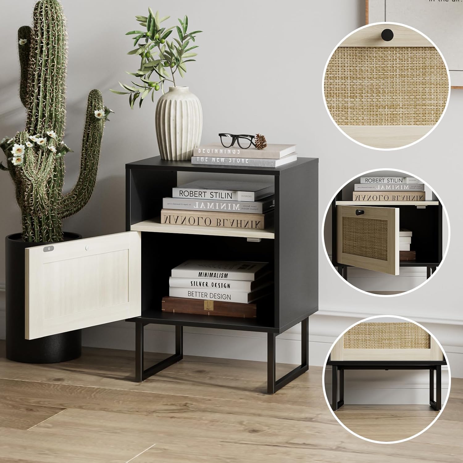 Masupu Boho Night Stand, Small Rattan Side Table, Wood Nightstand with Drawer and White Oak Shelf, Bedside Table, End Table for Bedroom,Living Room,Office (Black Frame)
