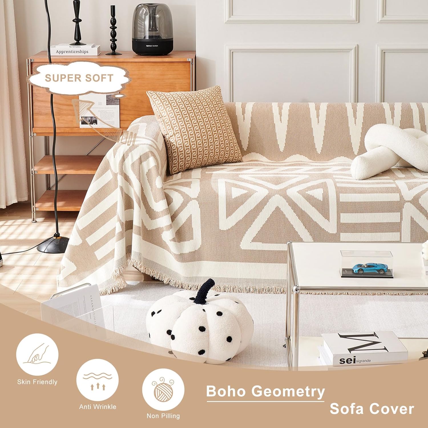 STACYPIK Durable Khaki Couch Covers for Dog Boho L Shape Armchair Slipcovers Tassels Couch Protector for 1 Cushion Couch Reversible Geometric Sofa Cover Anti Slip Multi-Use Couch Cover Blanket-71X71IN