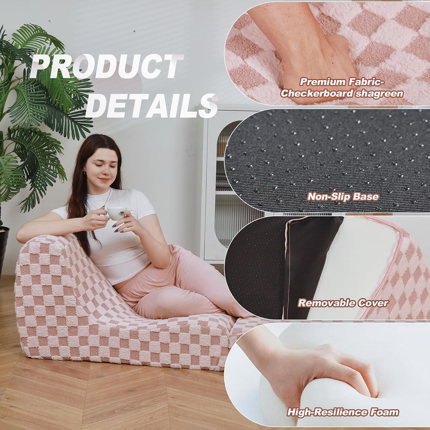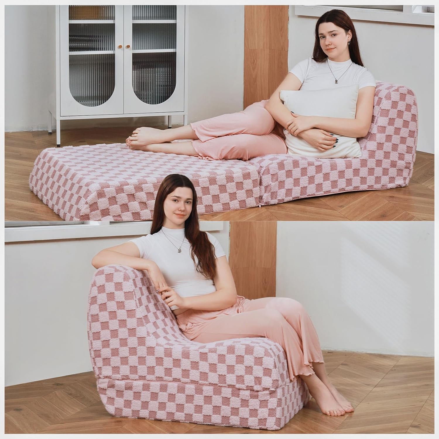 Bean Bag Chair with Checkerboard Shaker Fleece Fabric, Folding Sofa Bed, Floor Sleeper Lounge Chair, Lazy Sofa for Living Room, Bedroom, Apartments (Iceberry Pink)