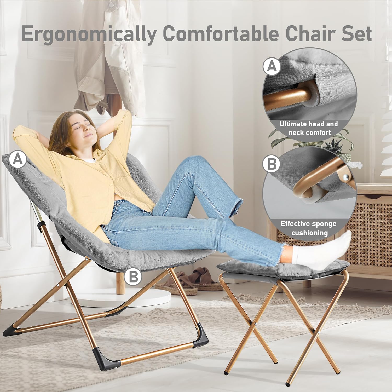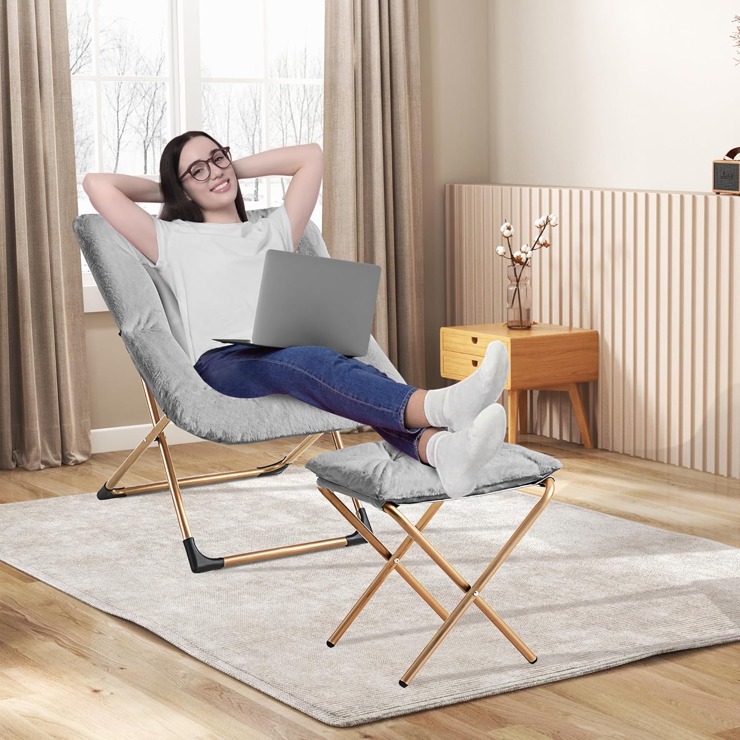 Comfy Oversized Saucer Chair with Ottoman,Soft Faux Fur Reading Lounge Chair for Adults,Stable X-Large Metal Frame and Non-Slip Pad,Cozy Chair for Bedroom, Living Room, Dorm, Light Gray