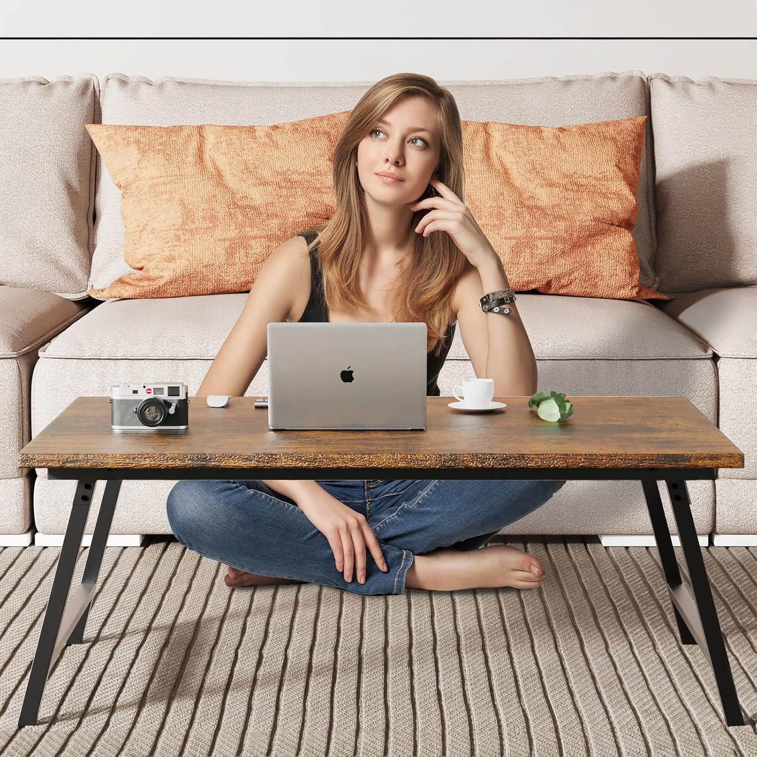 - 【Low Table for Sitting on the Floor】 The large area of 39.37’’ x 23.62’’of this folding table could provide ample space for your daily activities. Additionally, 15.75’’ height allows you to sit on the floor to work, have a dinner, among other things. It provides support for your feet when sitting on the sofa as well. Whether you need a workspace for your laptop or a spot to enjoy your morning coffee and breakfast, this foldable coffee table has got you covered