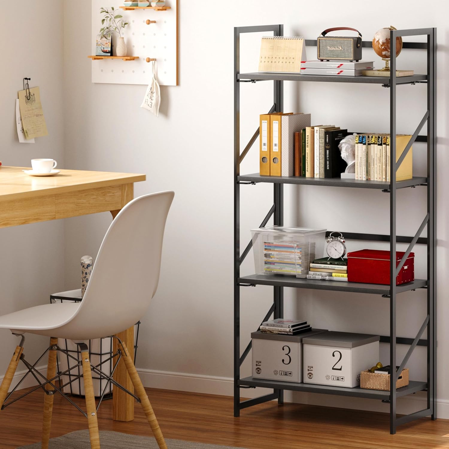 JSB No Assembly Folding Bookshelf, 4 Tier Industrial Metal Book Shelf for Storage, Vintage Wood Foldable Bookcase for Living Room, Bedroom, Office Organization Shelves