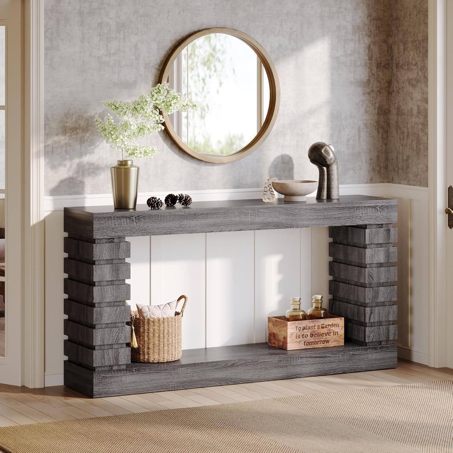 - Entryway Table with Storage: This long console table is specially designed with a geometric wood base and 2 tiers of shelves. It not only elevates your home decor but also enhances storage capabilities, ideal for placing boxes, crafts, or books.