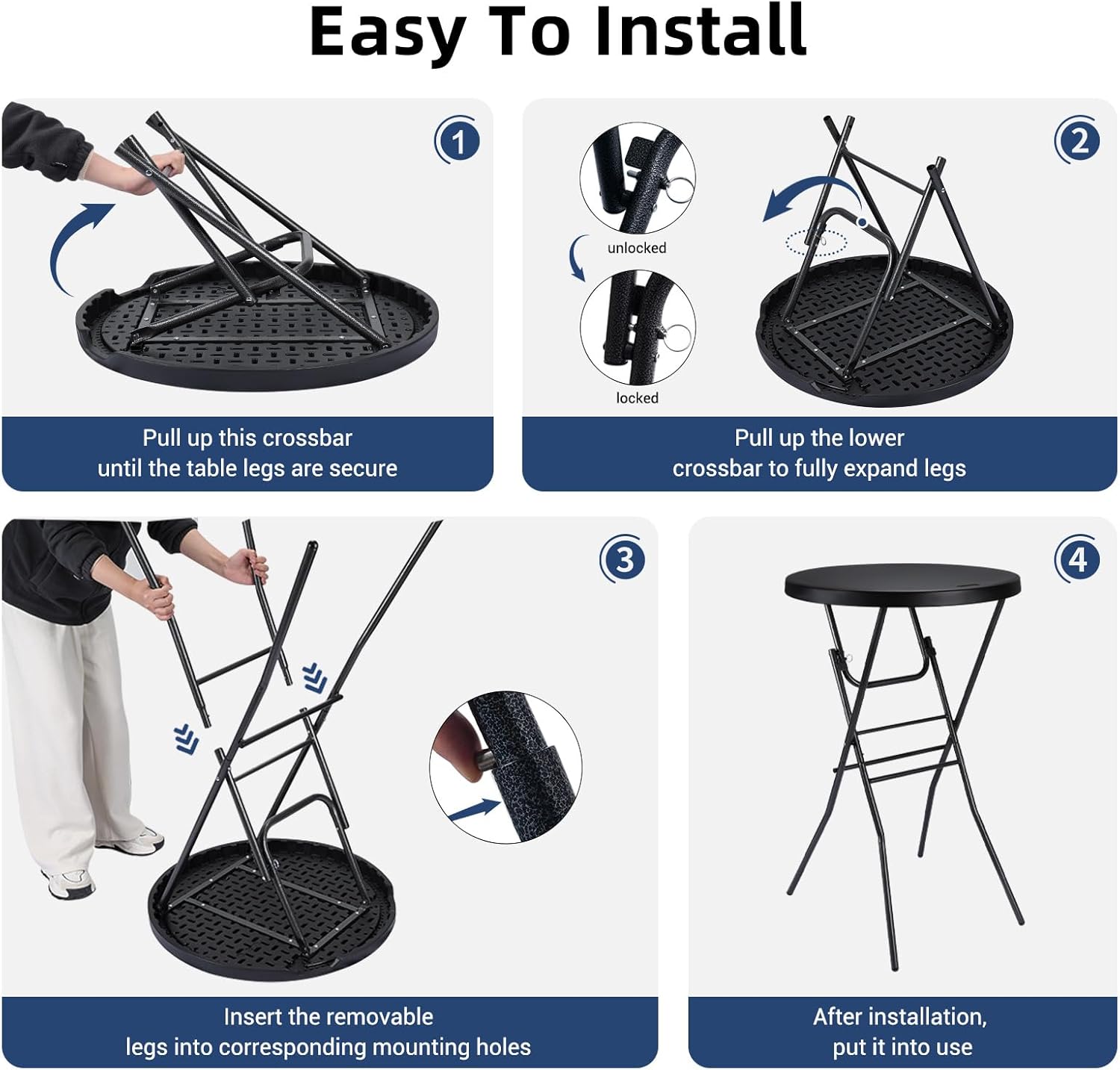 - EASY TO INSTALL: When installing, unfold the legs fixed on the desktop, then insert and lock the split legs in the form of a combination rod. In just a few minutes you will have a simple, functional and elegant black bar height folding table