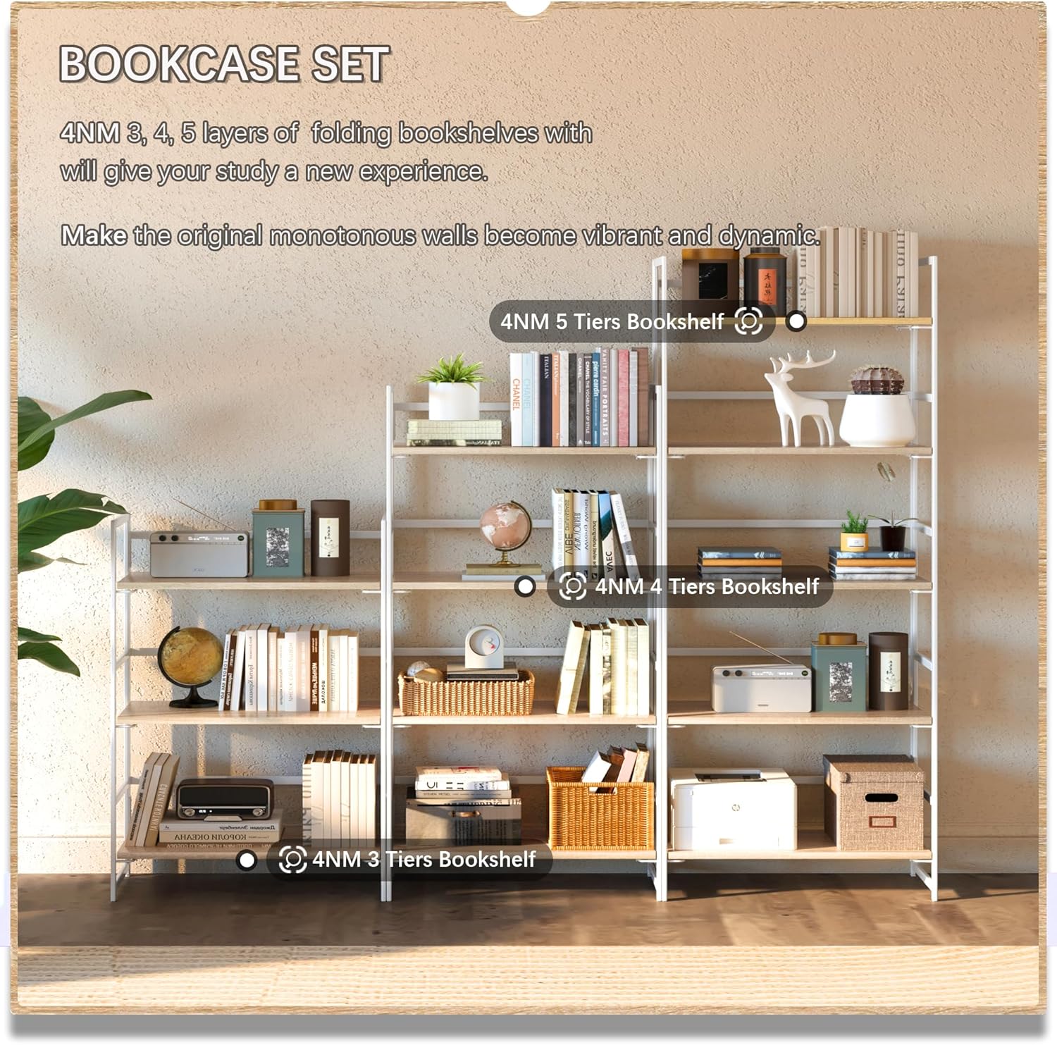 4NM No Assembly 4 Tiers Book Shelves, White Folding Bookshelf Bookcase Open Industrial Foldable Shelves for Bedroom, Living Room, Home Office - Natural White