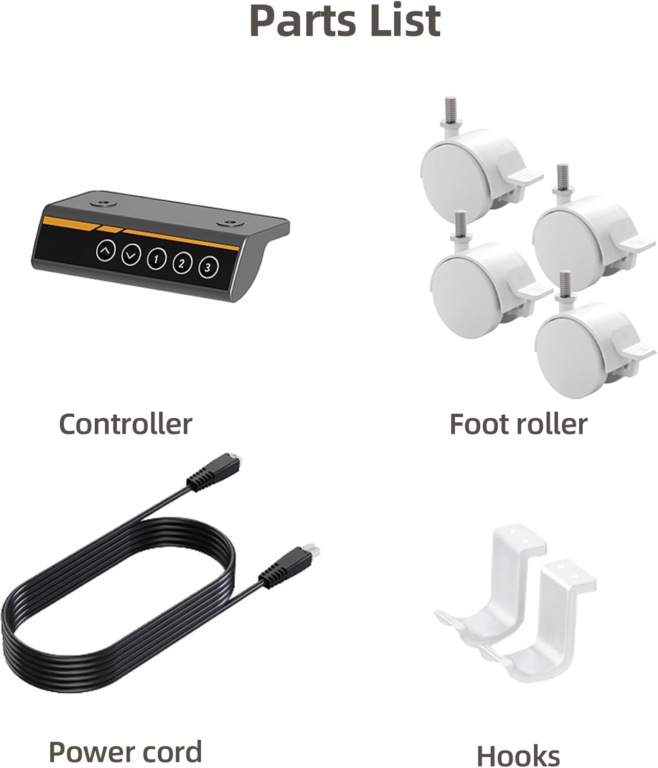- Worry-free Usage: We have provided you with a comprehensive set of accessories for immediate use, including Control Panel (x1), Power Supply (x1), A screw kit, Foot Pads&Casters (x4), and Hangers (x2).(Tabletop must be purchased separately)