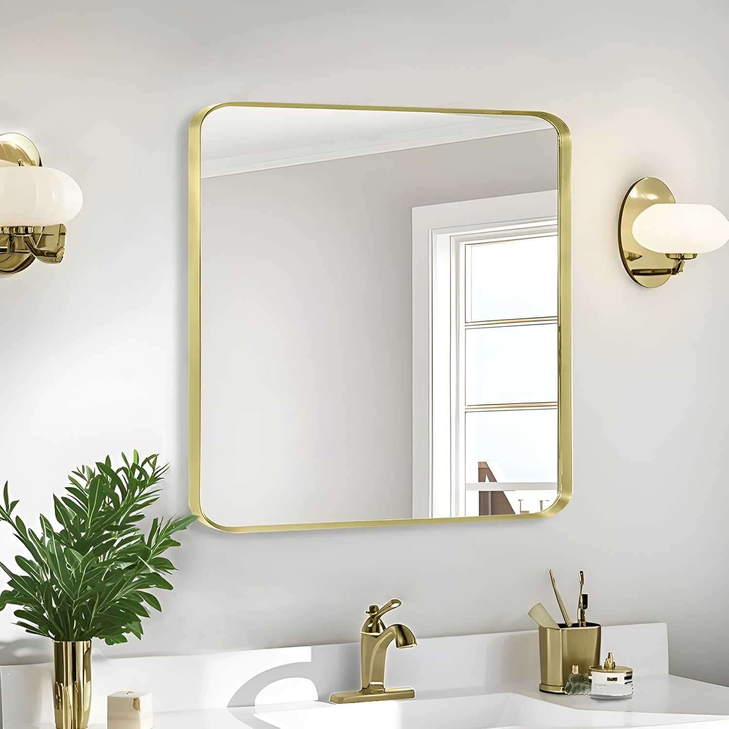 Wall Mount Mirror for Bathroom, Brushed Gold Metal Framed Rounded Corner Square Rectangular Vanity Mirror (30" x 30", Gold)