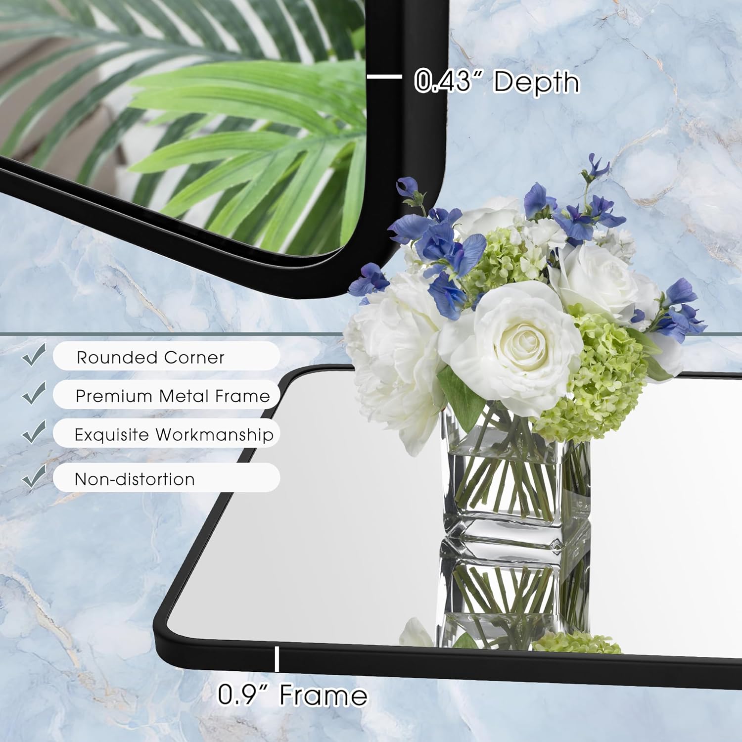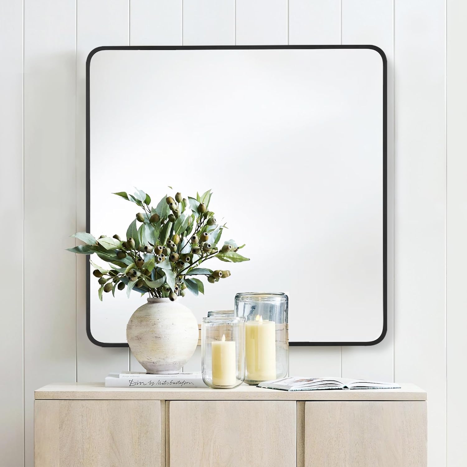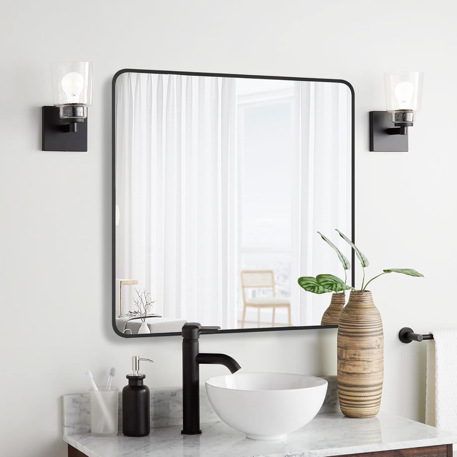 30x30 Inch Rectangle Bathroom Mirror with Black Metal Frame, Rounded Corner Rectangular Vanity Mirror for Wall, Modern Large for Bedroom, Living Room, Horizontal or Vertical
