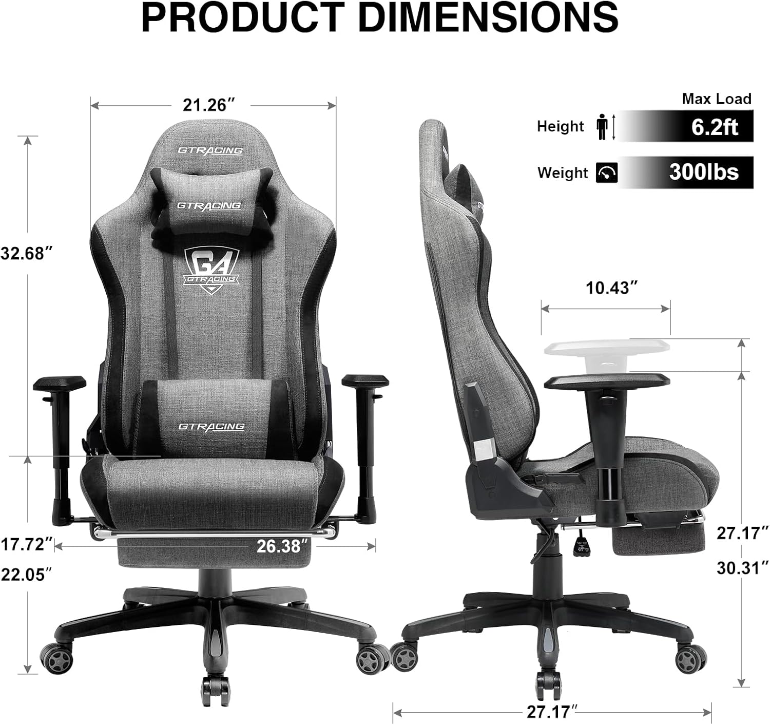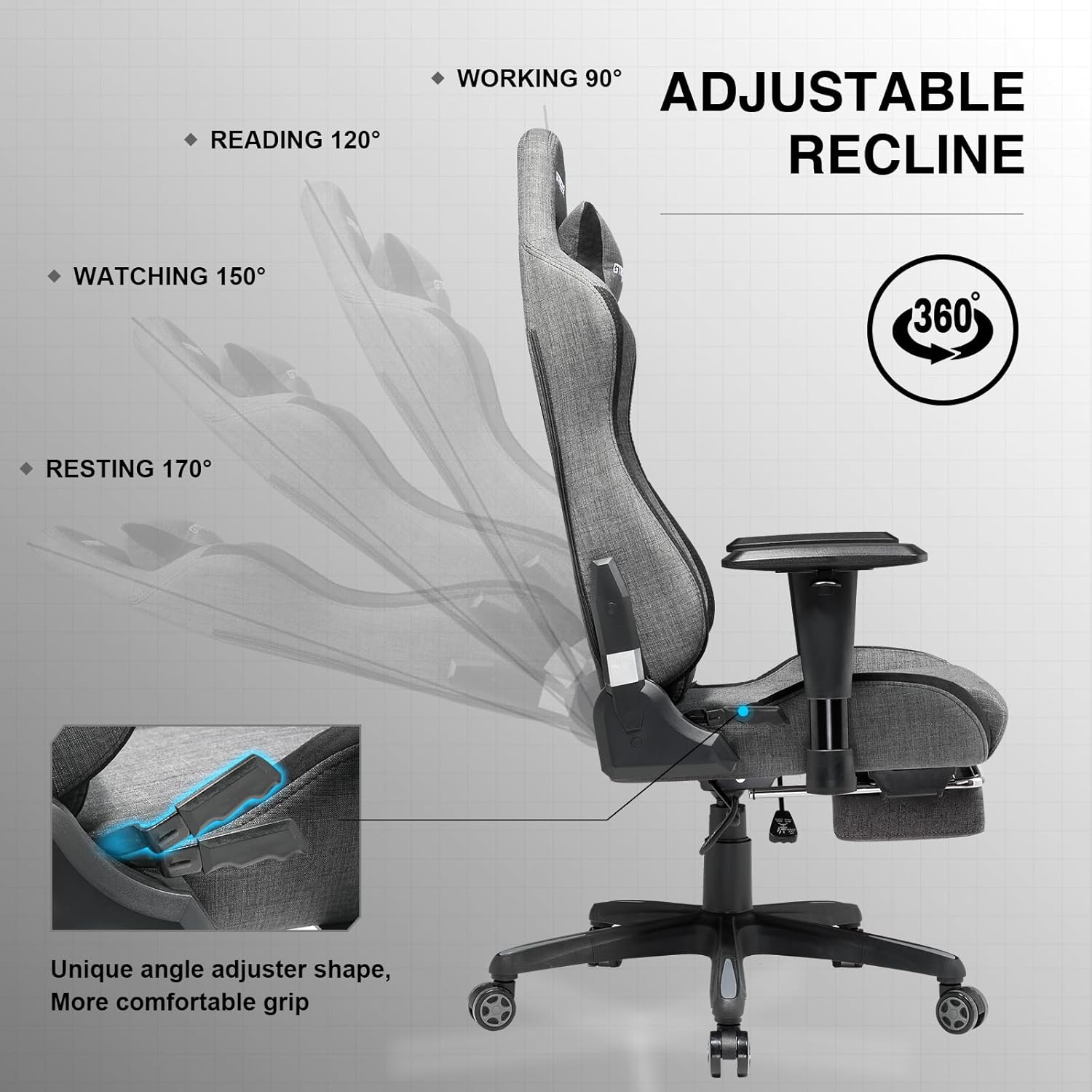 GTRACING Gaming Chair with Footrest, Fabric Breathable Big and Tall Ergonomic Computer Chair 350 lbs with Adjustable Lumbar Support and Recliner,High Back Game Chair for Office Gaming, Grey