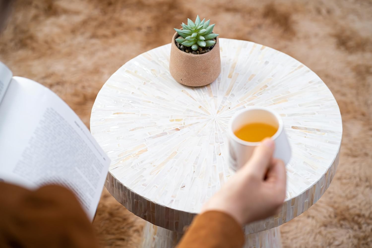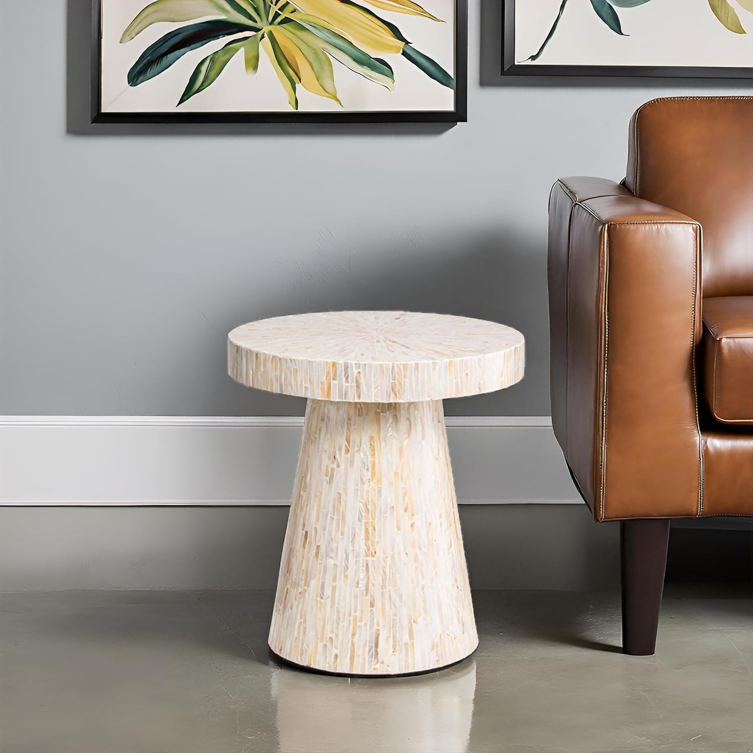 PEMAR Mother of Pearl Pedestal Side Table Modern Mushroom Minimalist Drink Accent End Table for Small Space, Bedside for Bedroom, Living Room, Hallway (White & Cream Sunlight)