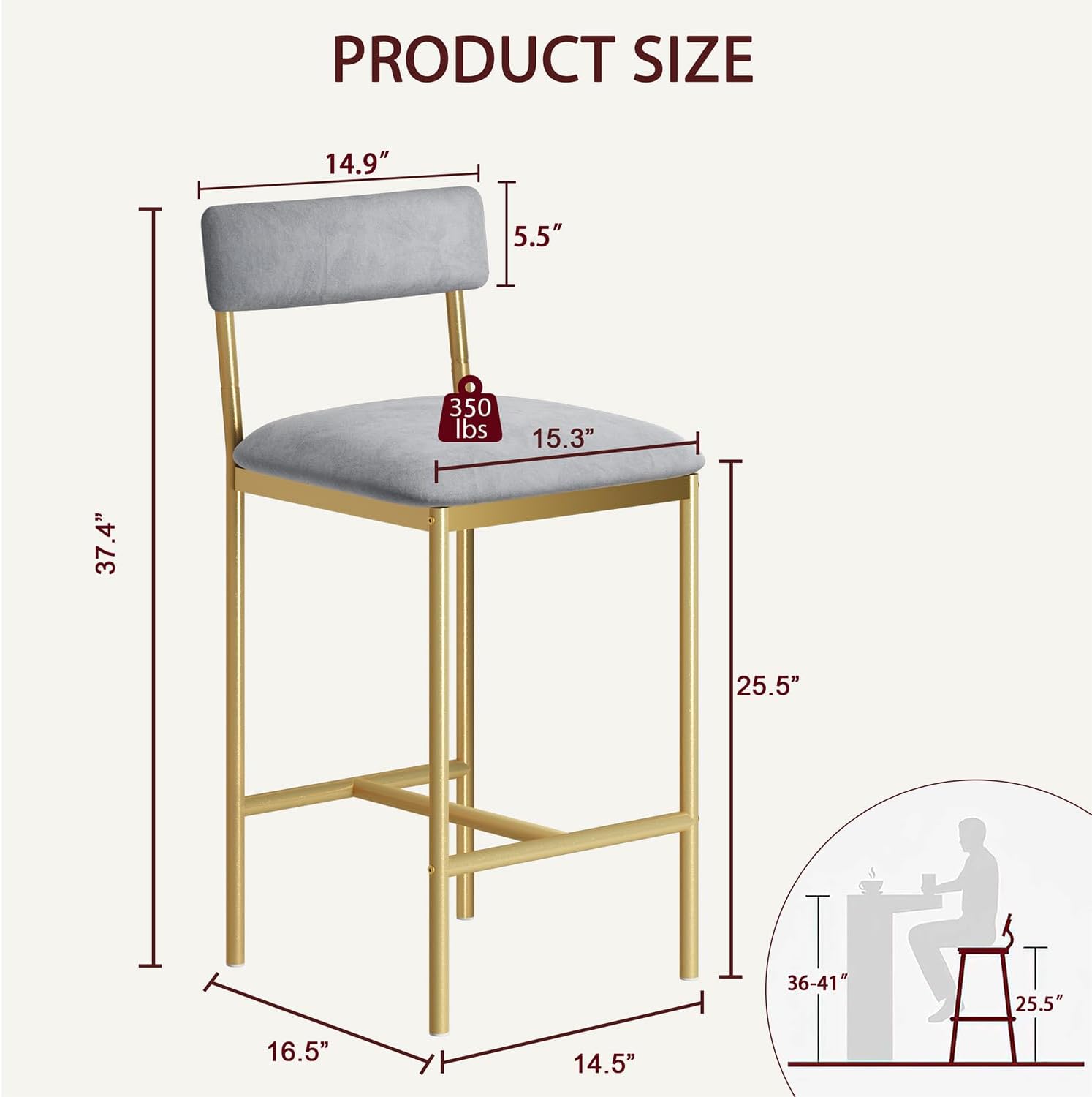 GarveeHome Bar Stools Set of 2, Upholstered Counter Height Bar Stools with Backrest and Footrest, Kitchen Barstools for Island, Counter Bar, Easy Assembly, Gold-Gray