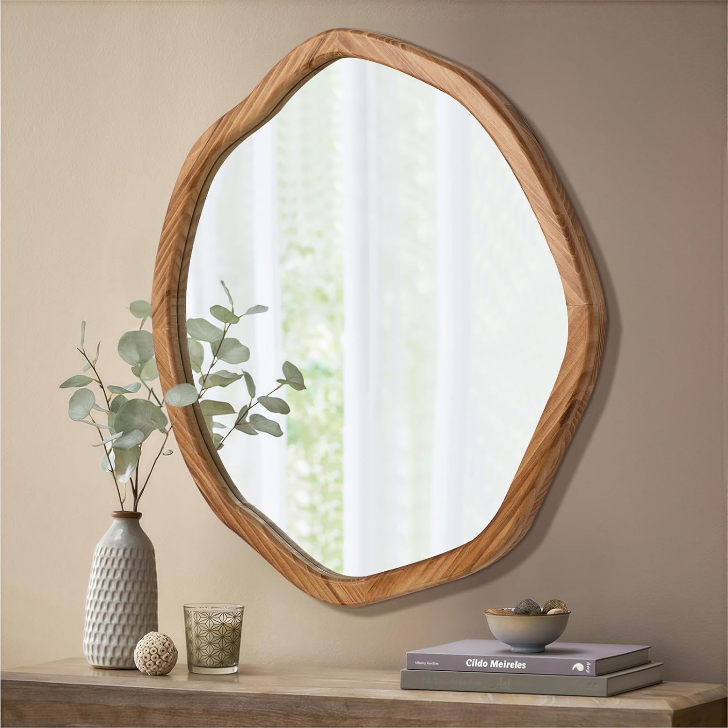• Unique Asymmetrical Design: The irregular wall mirror looks like a round mirror as a whole, each circle mirror is a unique piece of art, Its unconventional round form, combined with a natural wood frame, creates an eye-catching focal point