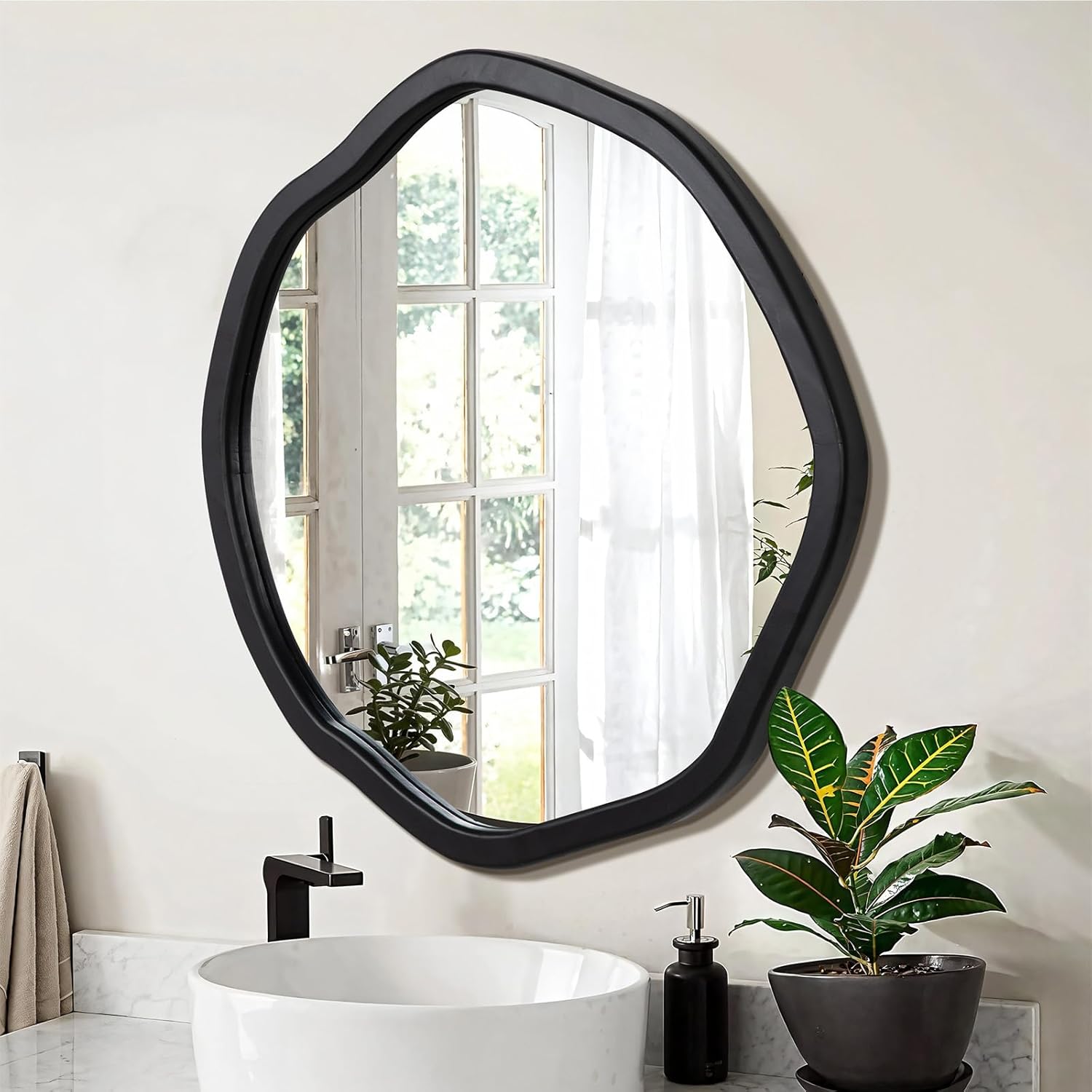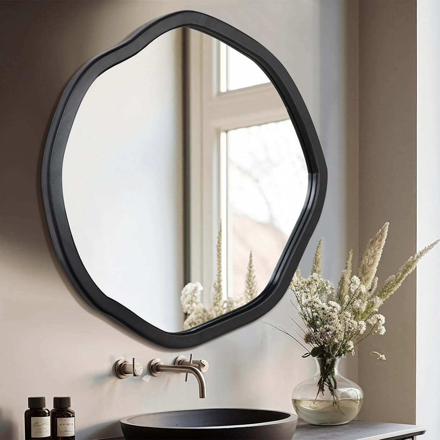 ULIKE Round Wood Mirror, 30 Inch Black Asymmetrical Circle Vanity Mirror with Wood Frame, Modern Decorative Wall Mount for Bathroom Bedroom Living Room Entryway