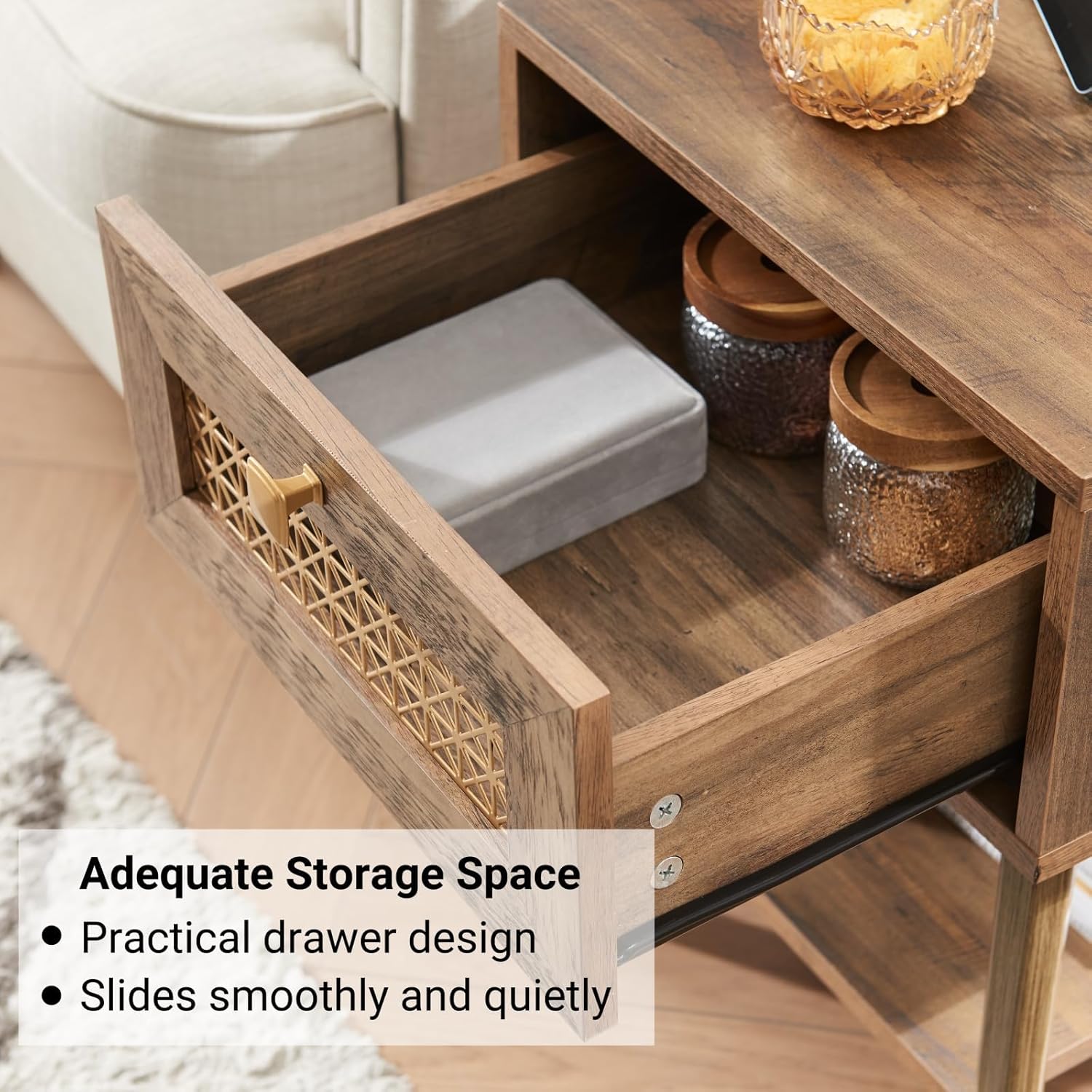 Boho Style Living Room Side Table, Wood End Table with Drawer and Shelf, Small Nightstand for Bedroom, Rustic Oak