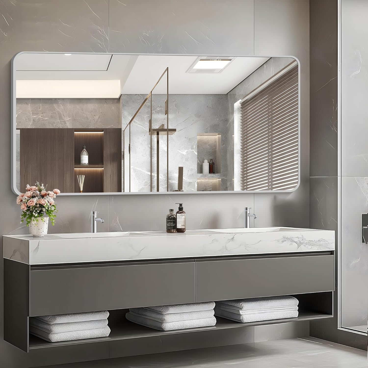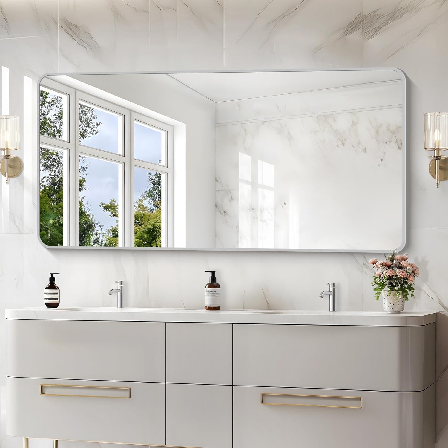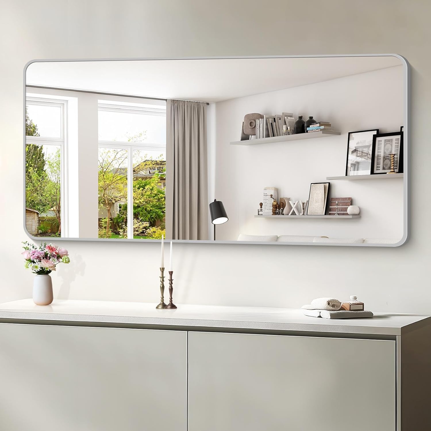 - ELEGANT ROUND CORNER DESIGN: This wall mounted rectangular mirror features smooth rounded corners design that adds a soft aesthetic to the space. The rounded corners design also help to avoid the risk of being scratched by the corners of the mirror, safety and elegance, give you a better sense of use. Not only functional but also decorative. Make your whole room elegance and enhance your home decor.