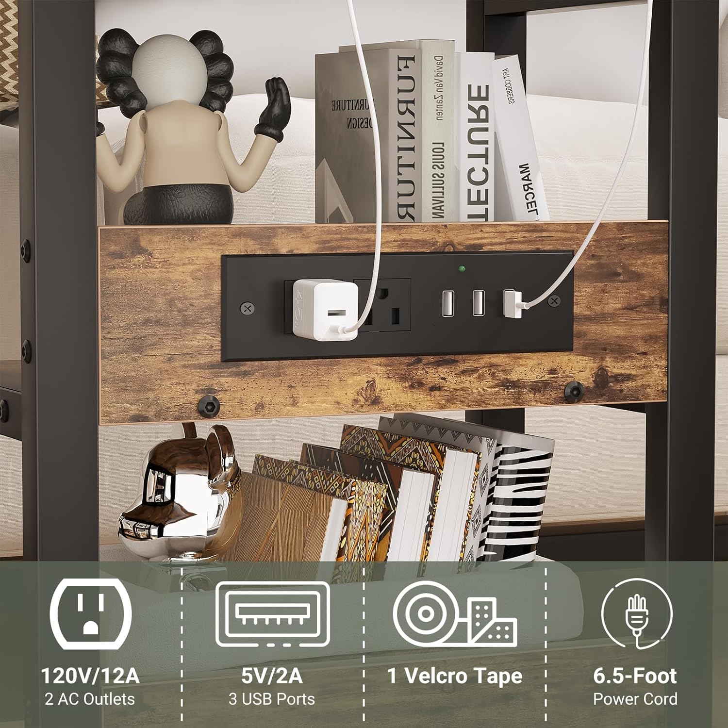 Height Adjustable End Table with Charging Station, Mobile C Shaped Laptop Side Table with Wheels, 3-Tier Sofa Couch Table with Storage Shelve for Living Room Bedroom, Rustic Brown