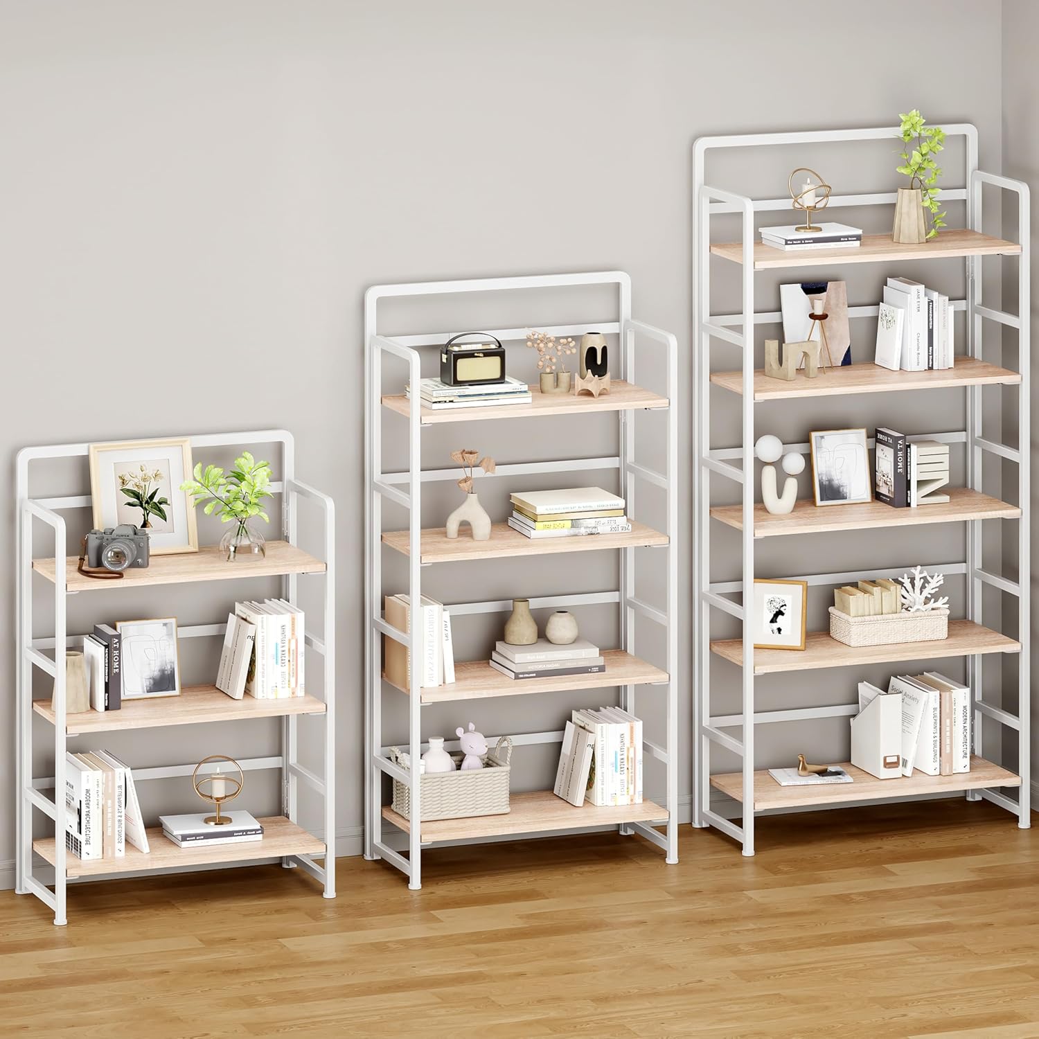 - Industrial Bookshelves: This industrial-style wood and metal bookshelf prioritizes practicality and durability. It is suitable for displaying decorative items and storing belongings, making it an ideal furniture choice for homes or offices. This bookcase available in various colors for selection, such as black, white, beige, rustic brown and so on.